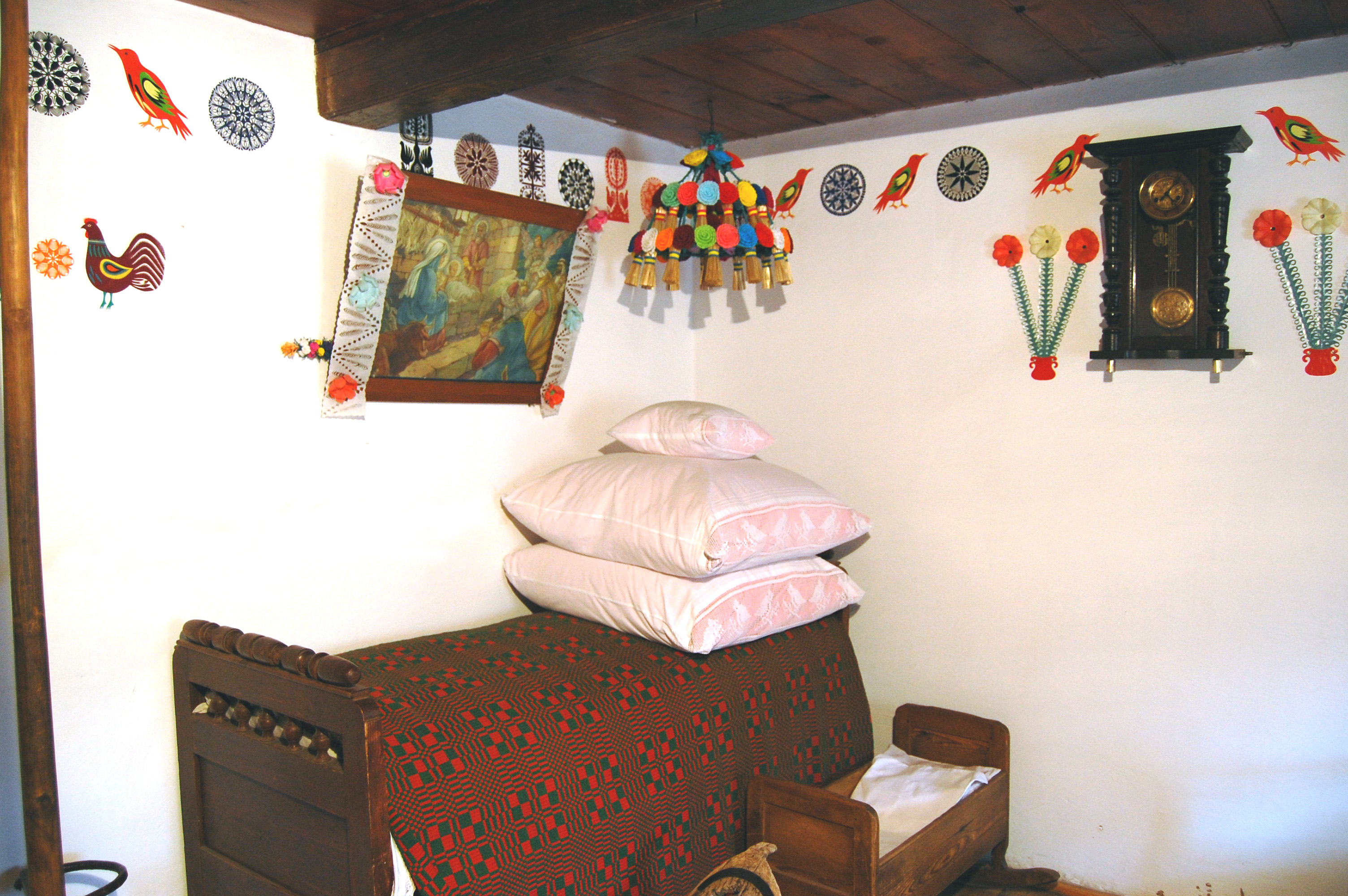 Duża izba, łóżko i poduszki z ręcznie wyszywanymi poszewkami.