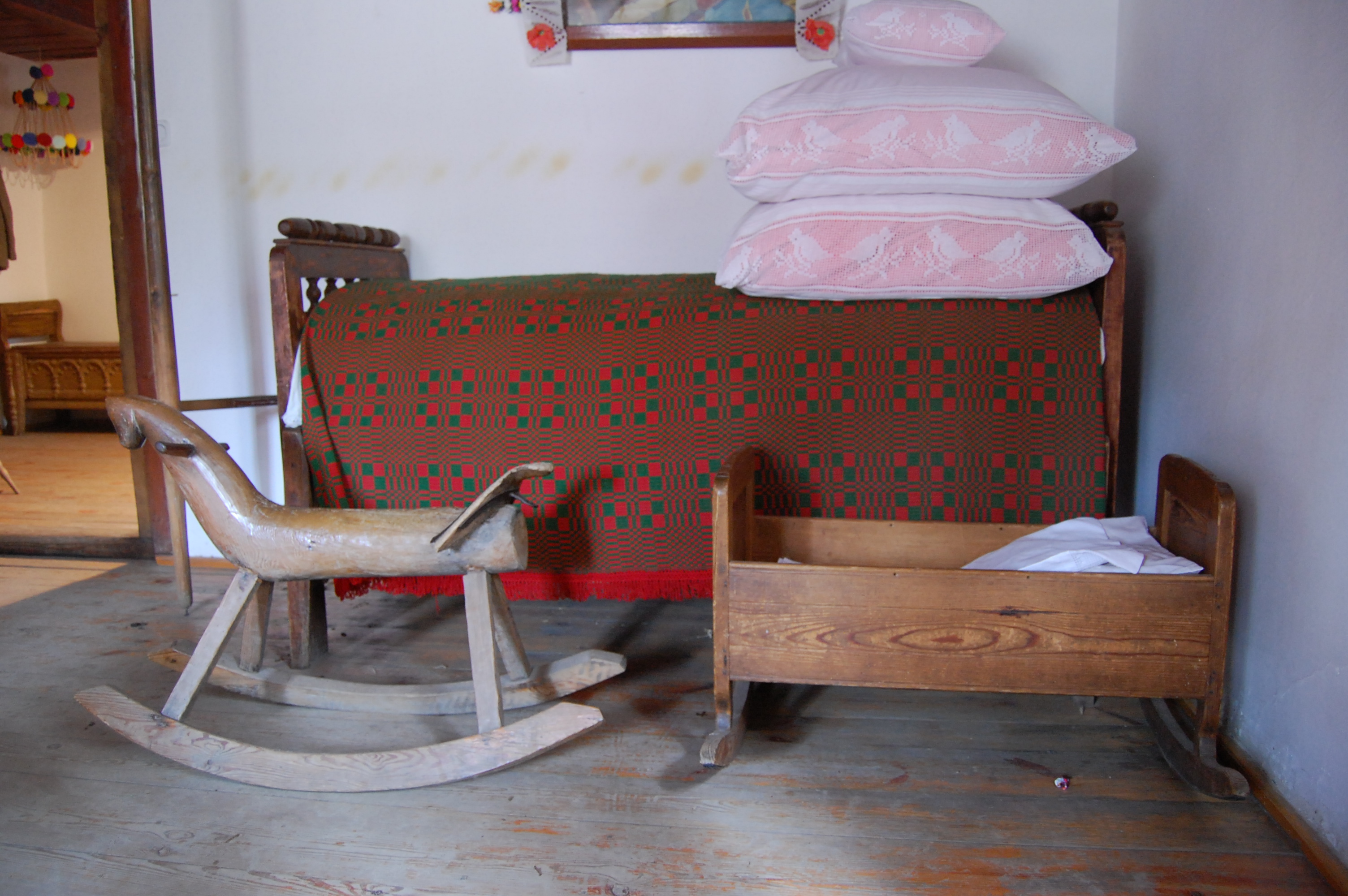 Konik na biegunach, łóżko i dziecięca kołyska z początku XX wieku we wnętrzu chałupy ze wsi Golanka.