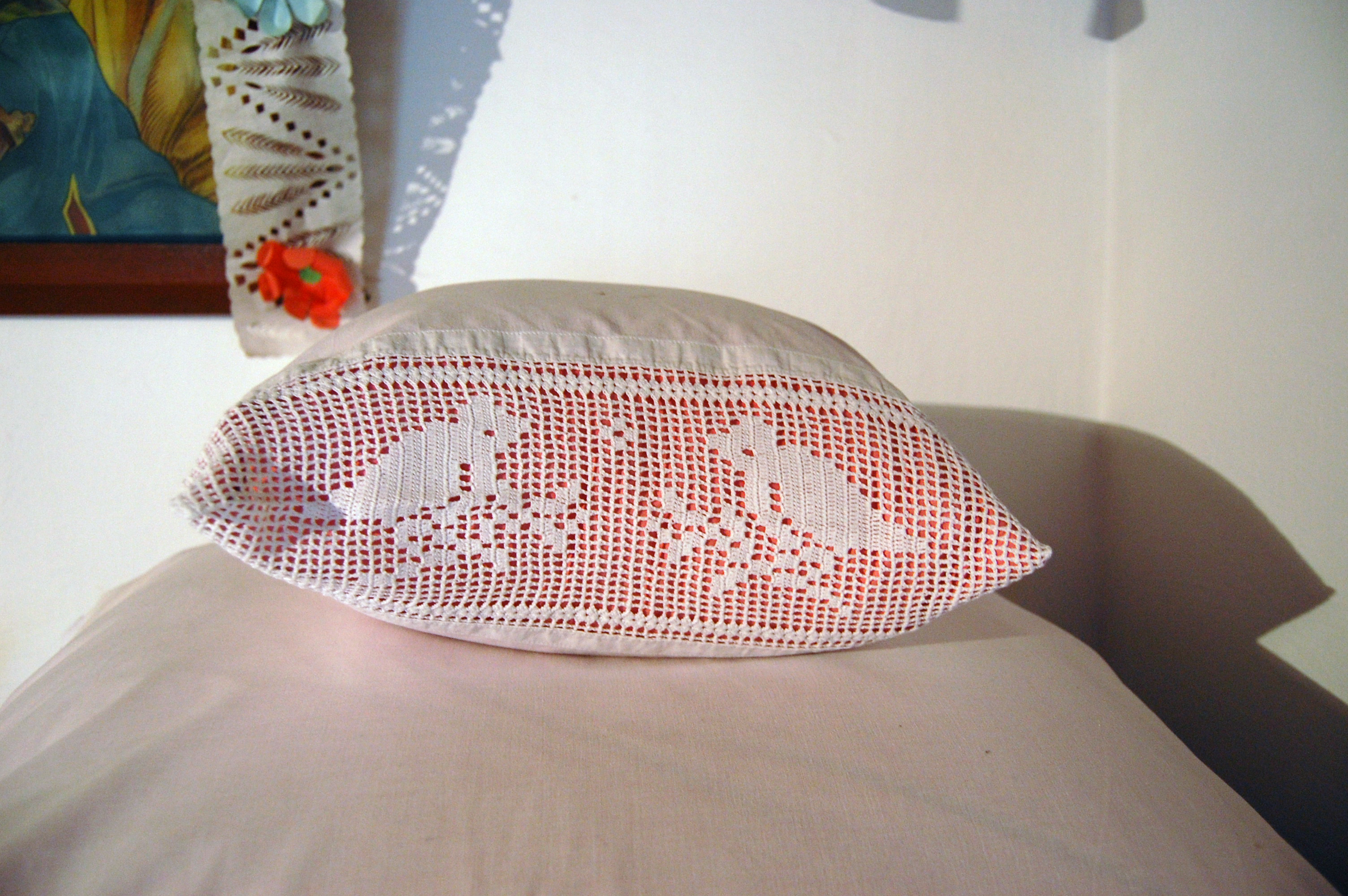 Poduszka z haftem ażurowym na poszewce.