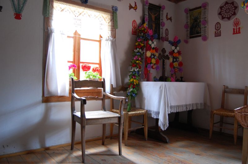 Wnętrze chałupy kurpiowskiej ze wsi Golanka. Na zdjęciu duża izba z widocznym „świętym kątem”, kurpiowską palmą wielkanocną i wycinankami na ścianach. Okno zdobi papierowa wycinanka zastępująca firankę.