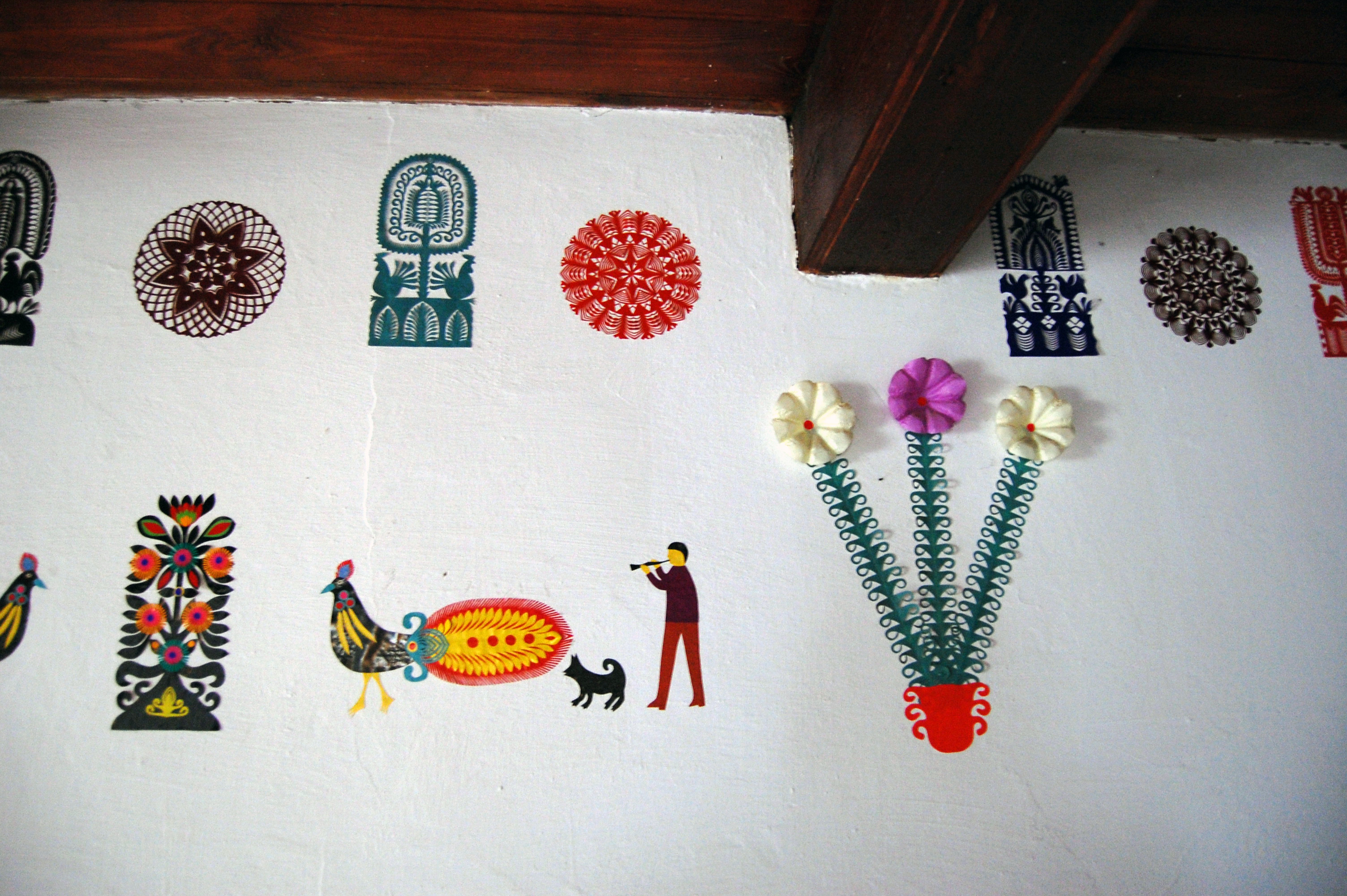 Wycinanki kurpiowskie, jednokolorowe wykonane wg wzorów tradycyjnych (rozeta, leluja), oraz współczesne wycinanki kolorowe.