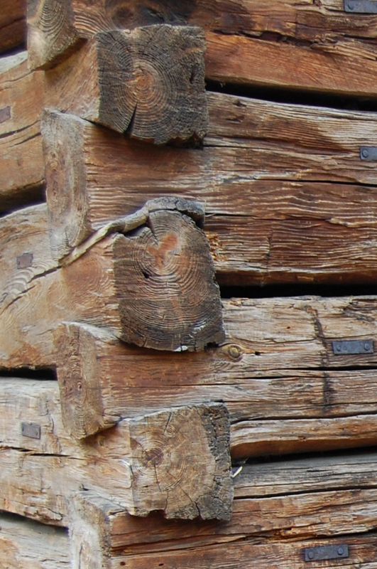 Fragment konstrukcji zrębowej z węgłami wiązanymi "na rybi ogon".