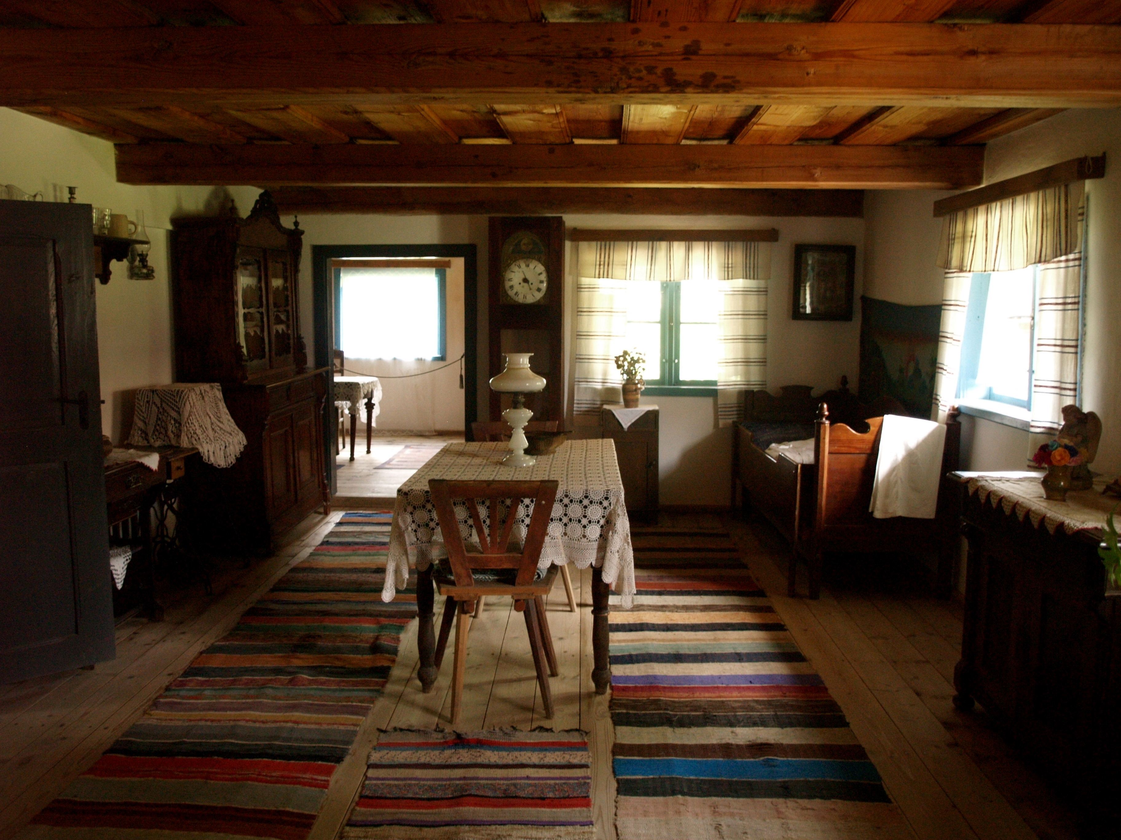 Wnętrze mieszkania rodziny zamożnego pszczelarza z lat 30 XX wieku. Podłoga z desek. W rogu po lewej widać bogato zdobiony kredens.
