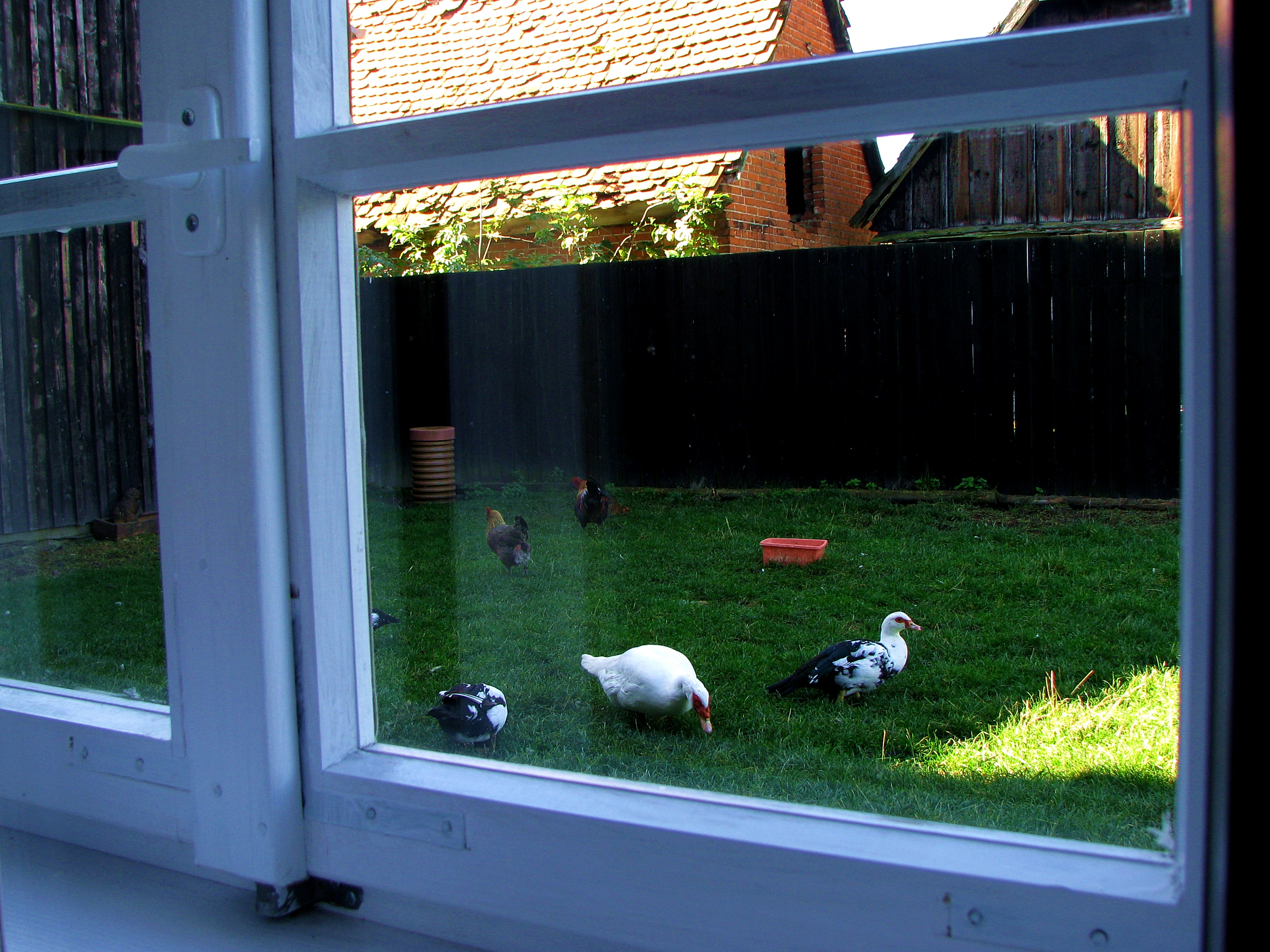 Zagroda Albrechta w Swołowie. na zdjęciu zwierzęta hodowane w zagrodzie (kaczki i kury zielononóżki) widoczne przez okno.