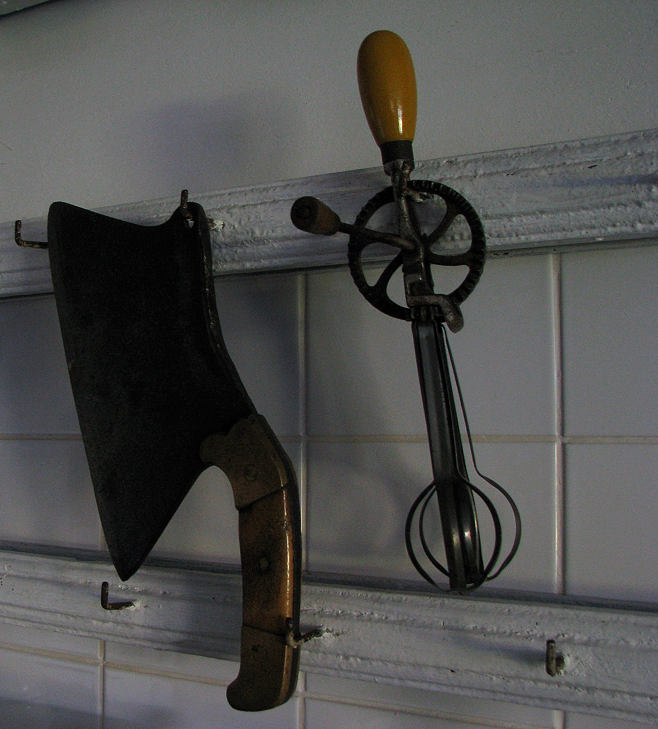 Zagroda Albrechta w Swołowie - wnętrze domu. Na zdjęciu wyposażenie kuchni: tasak i trzepaczka do jajek.