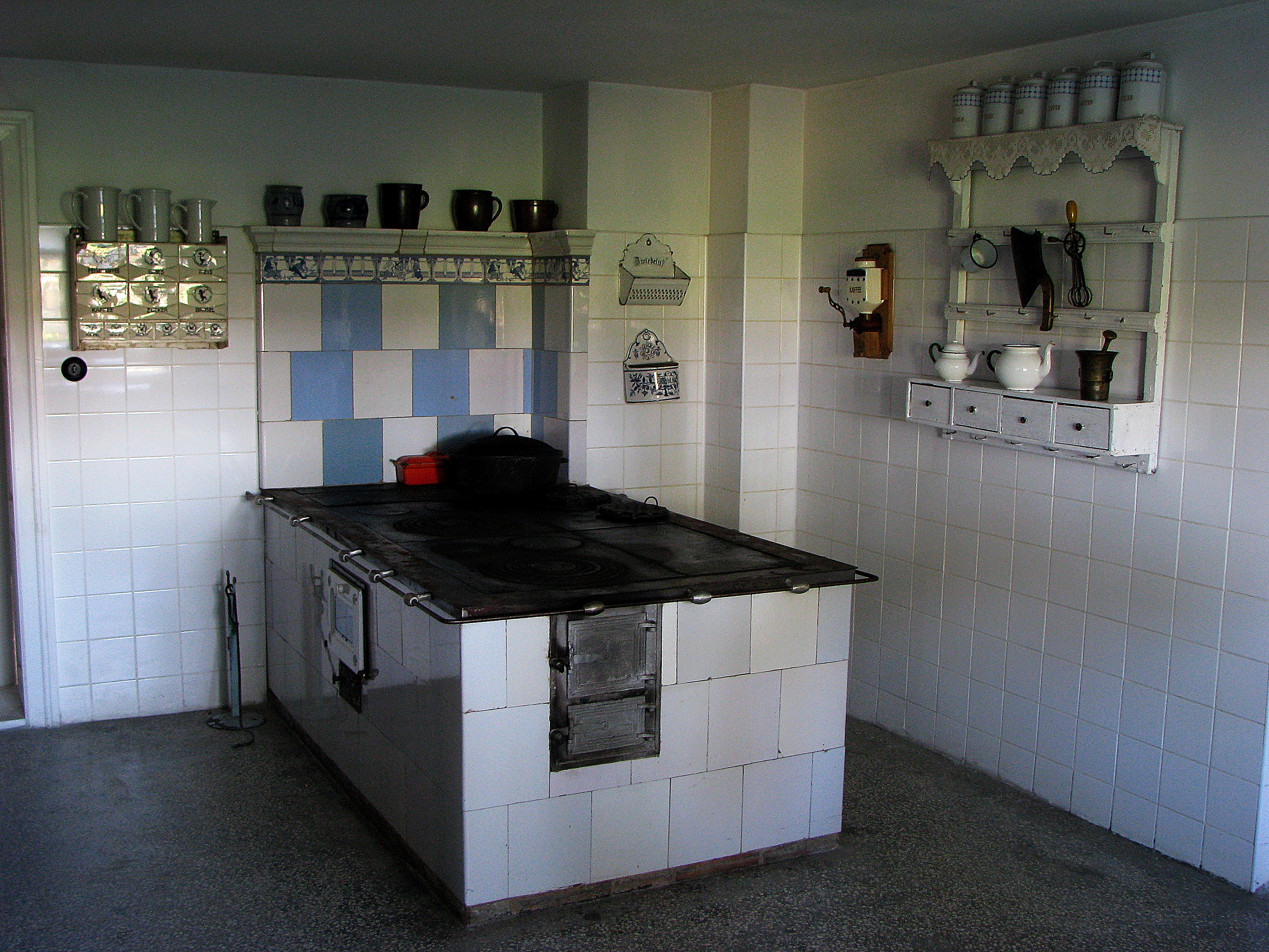 Zagroda Albrechta w Swołowie - wnętrze domu. Na zdjęciu wnętrze kuchni, w tym kuchnia węglowa.