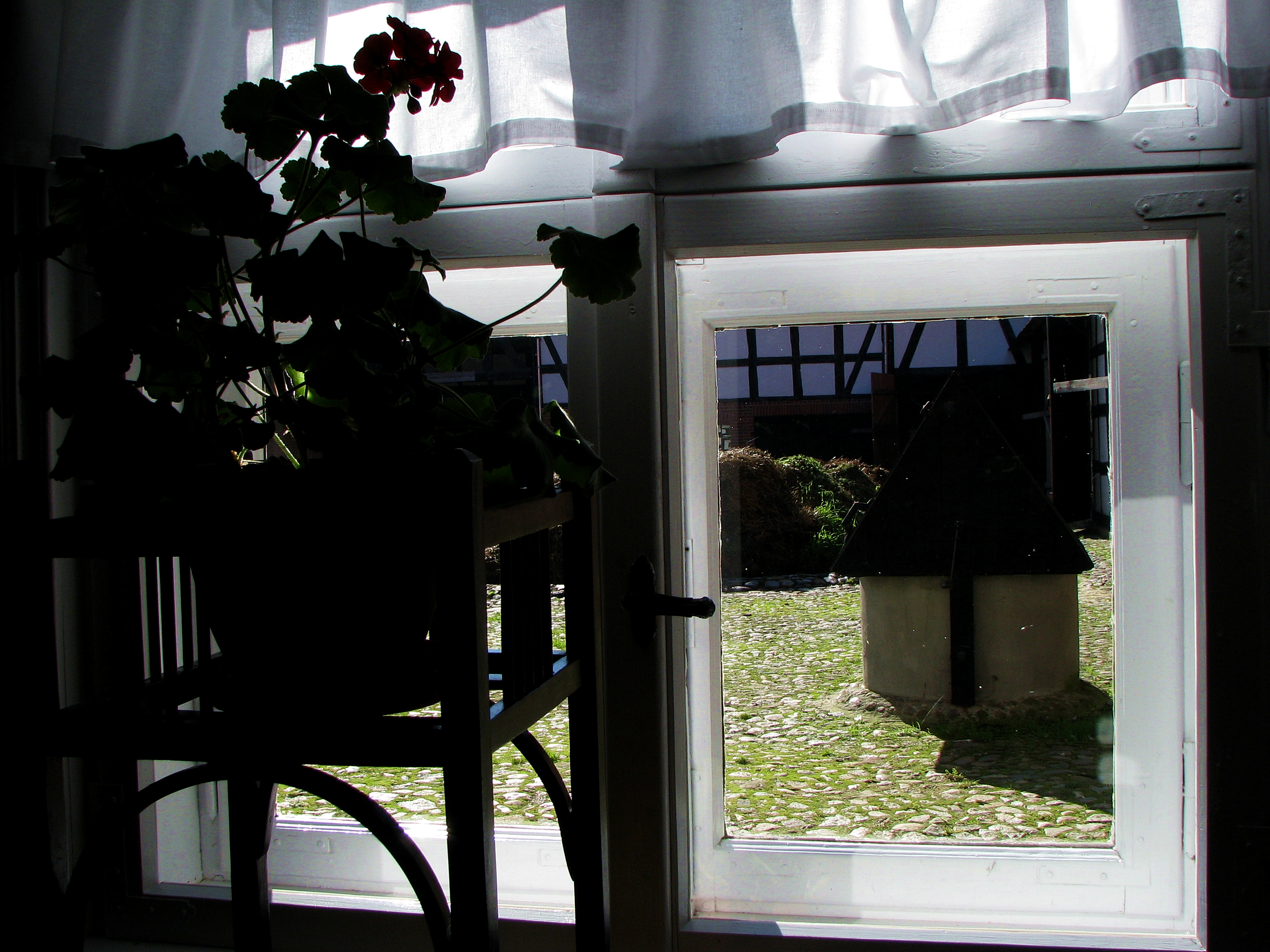 Zagroda Albrechta w Swołowie - wnętrze domu. Na zdjęciu widok z okna na podwórko.