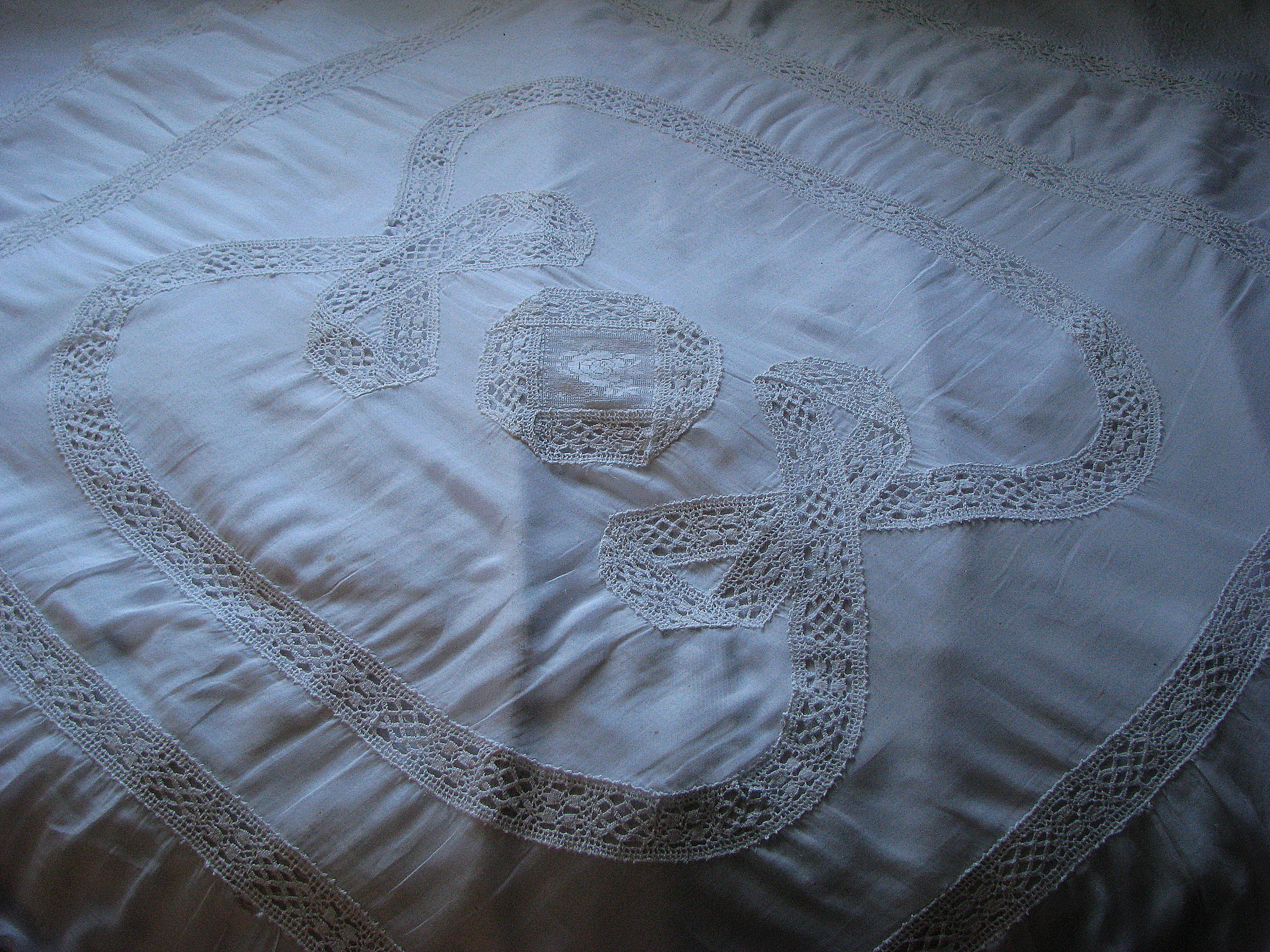 Zagroda Albrechta w Swołowie - wnętrze domu. Na zdjęciu fragment haftu na pościeli.