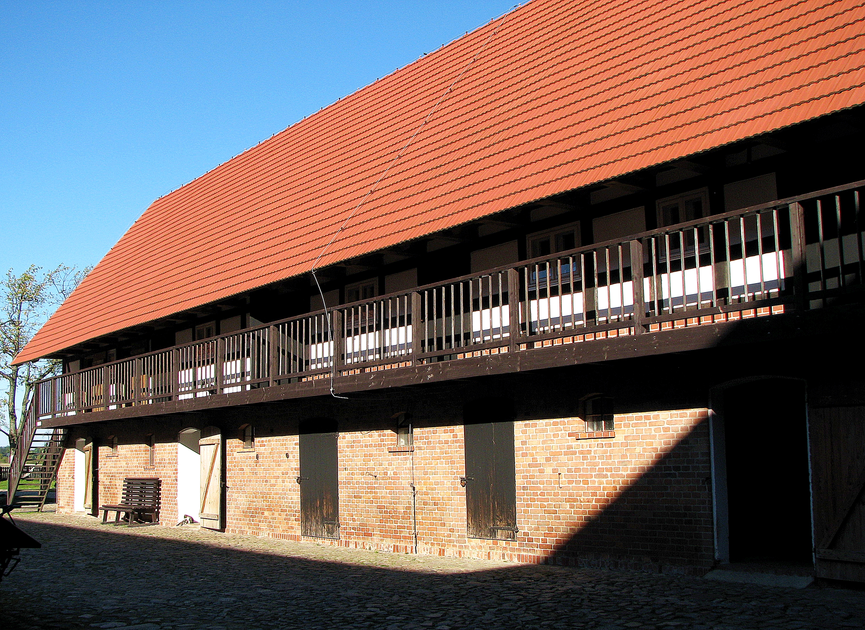 Zagroda Albrechta w Swołowie. Na zdjęciu budynek gospodarski z galerią. Dziś na parterze znajdują się pomieszczenia dla zwierząt, na piętrze - sale ekspozycyjne.