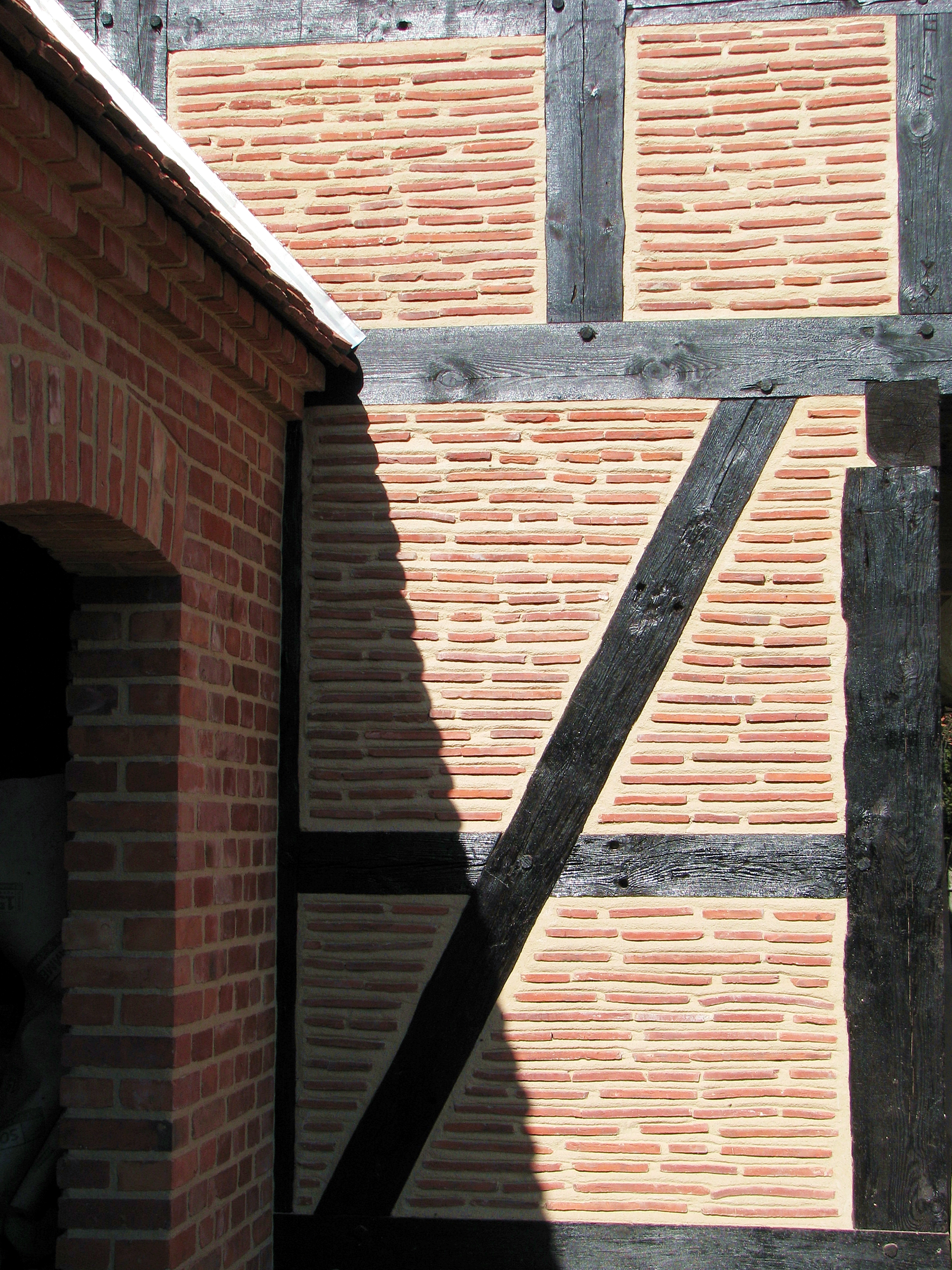 Zagroda Albrechta w Swołowie. Na zdjęciu fragment kosntrukcji szachulcowej (konstrukcji szkieletowej). Przestrzeń między elementami szkieletu jest wypełniona dachówkami. Takie rozwiązanie nie jest typową praktyką w budownictwie.