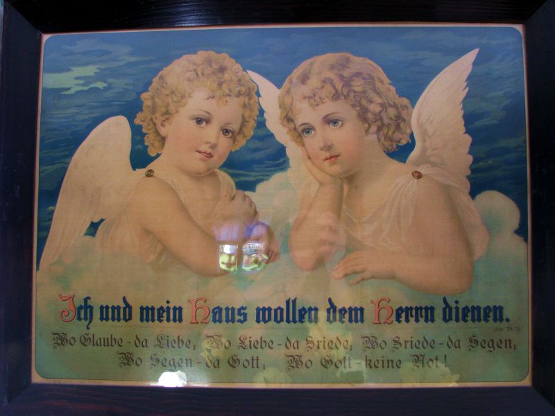 Zagroda Albrechta w Swołowie - wnętrze domu. Na zdjęciu oleodruk z aniołkami i cytat z Bibliii "Ich aber und mein Haus wollen dem Herrn dienen" (Jozue 24,15) ("Lecz ja i Dom mój służyć będziemy Panu").