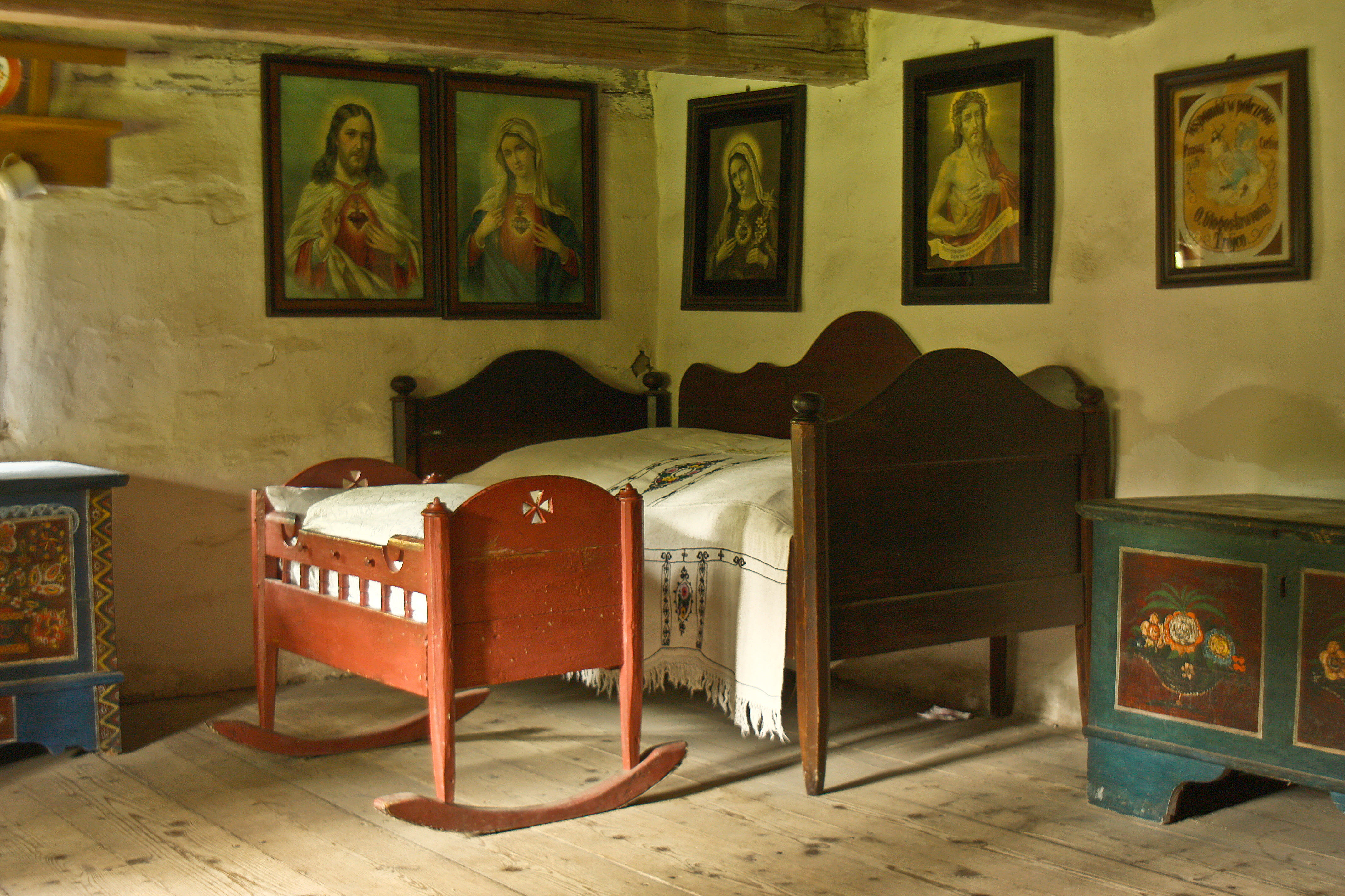Biała izba (izba odświętna, dla gości) wewnątrz chałupy ze wsi Dąbrówka Dolna. Wyposażenie z końca XIX wieku. Wśród reprezentacyjnych elementów wyposażenia wymienić należy – ciemnoniebieską opolską skrzynię wianną (wyznacznik zamożności i prestiżu wiejskiej rodziny). Na ścianach wiszą oleodruki o treści religijnej.