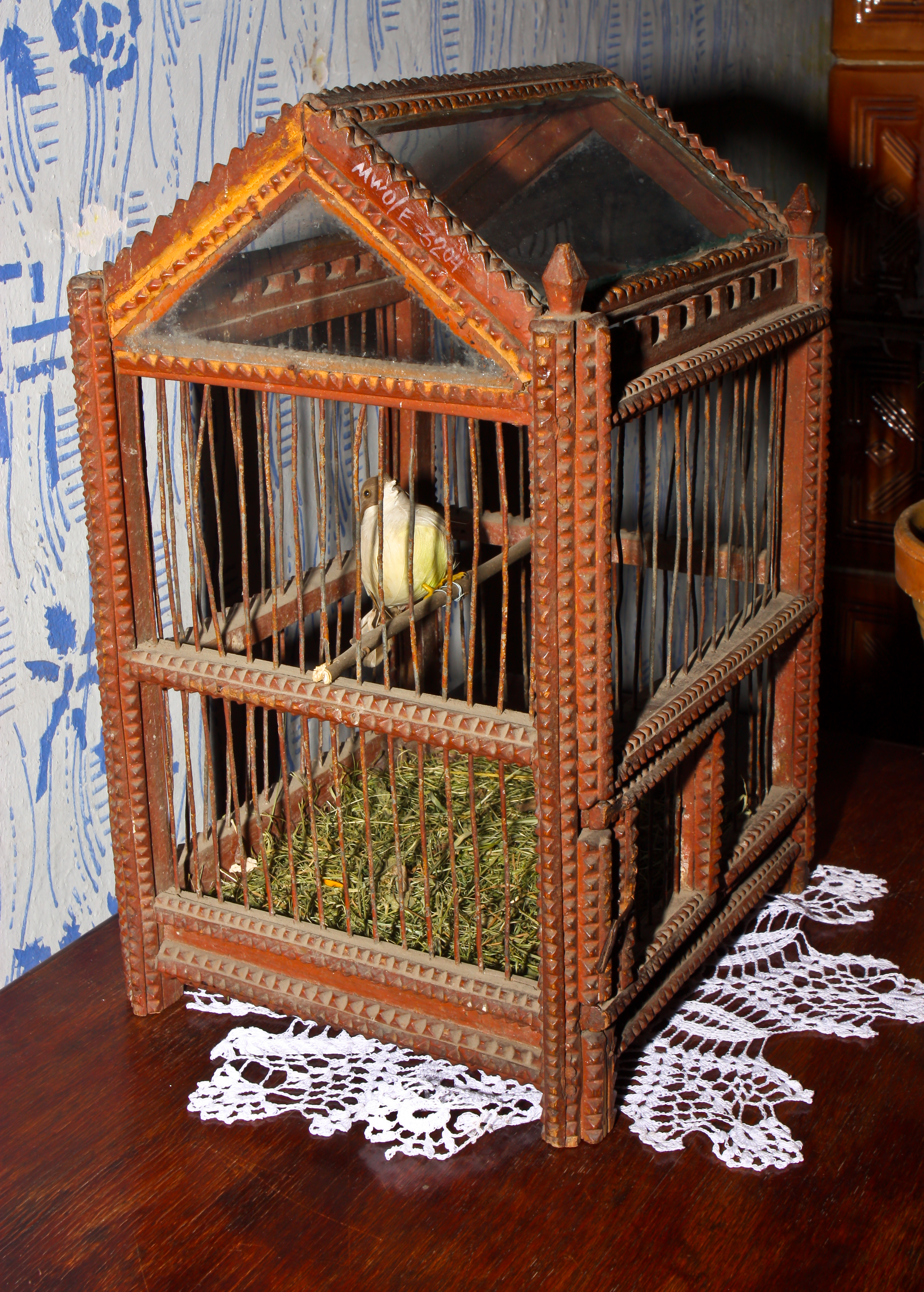 Zdobiona, drewniana klatka dla ptaka we wnętrzu chałupy ze wsi Radłowo z 1823 roku.