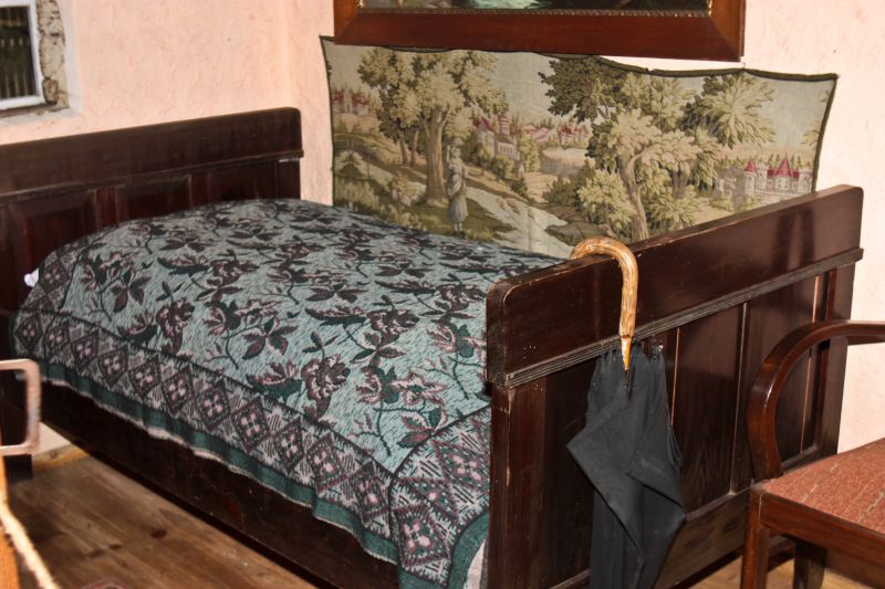 Wyposażenie chałupy ze wsi Kup. Fornirowana wersalka z opolskiego zakładu stolarskiego z lat 20 XX wieku.