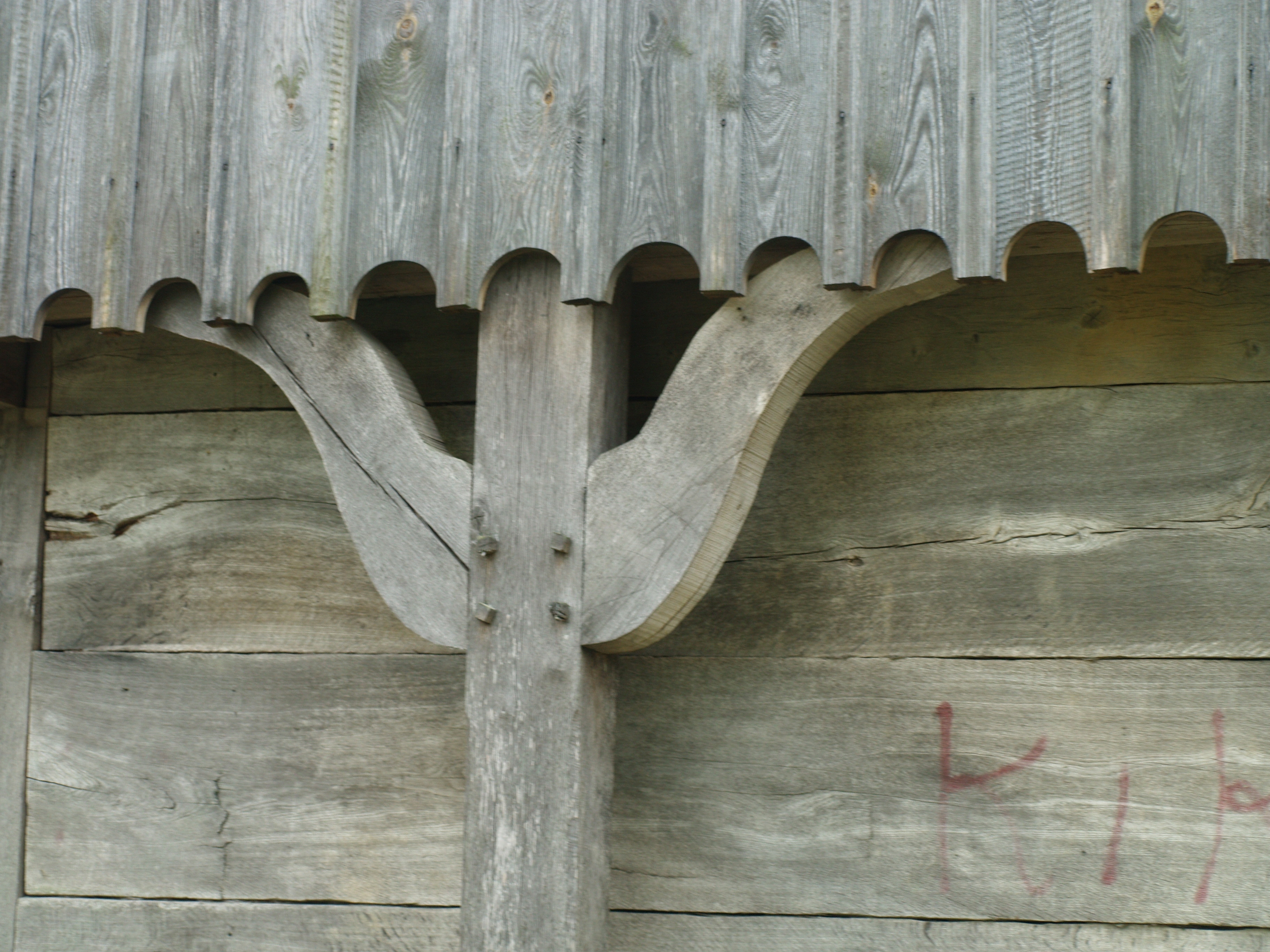 Fragment pionowej podpory dachu (przysłup) chałupy ze wsi Nowa Różanka z pierwszej połowy XIXw.