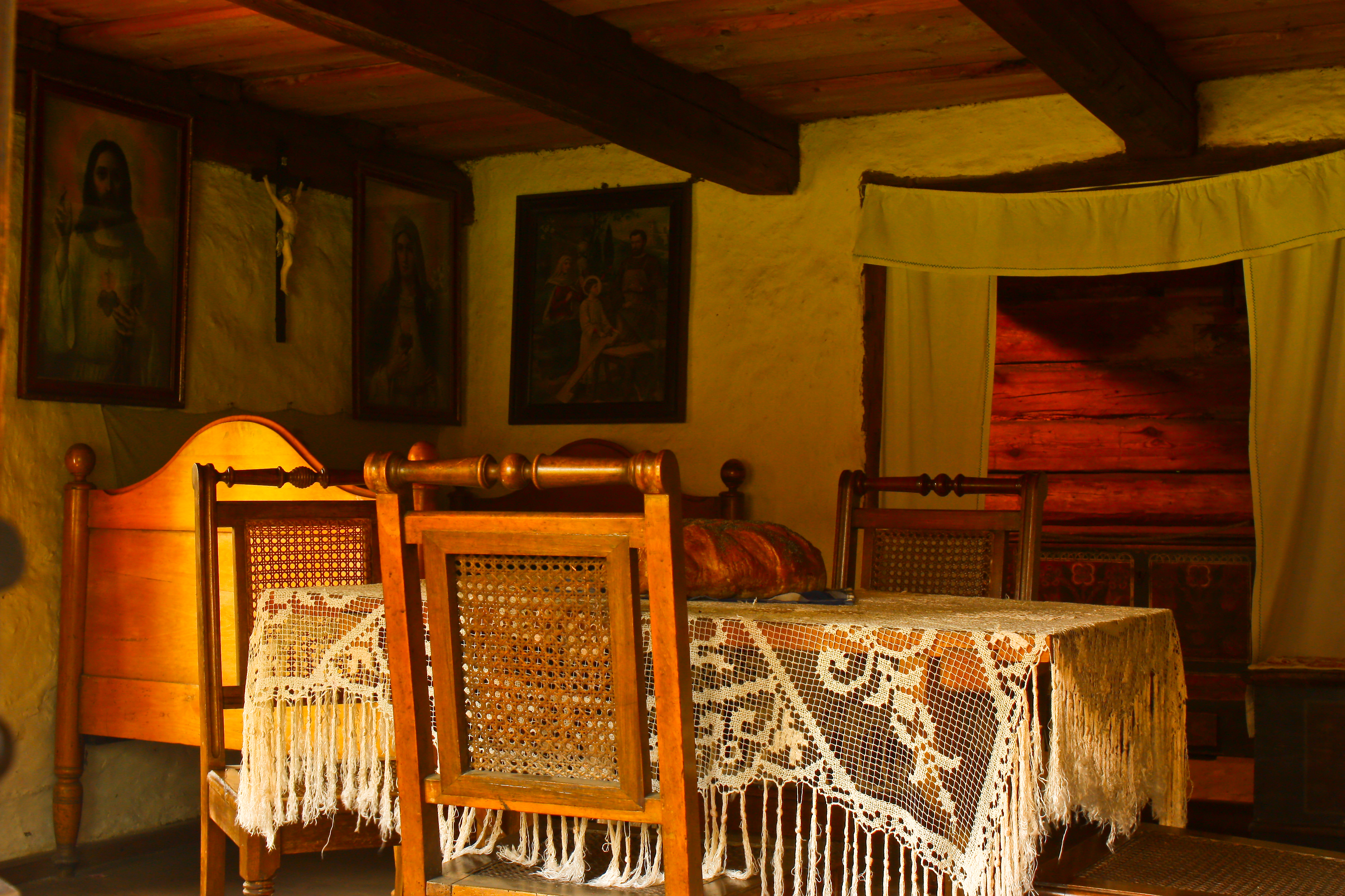 Wnętrze czarnej izby w chałupie ze wsi Antoniów z początku XIX wieku. Wyposażenie charakterystyczne dla zamożnej rodziny wiejskiego młynarza z końca XIX wieku. Na ścianie wiszą święte obrazy (oleodruki).