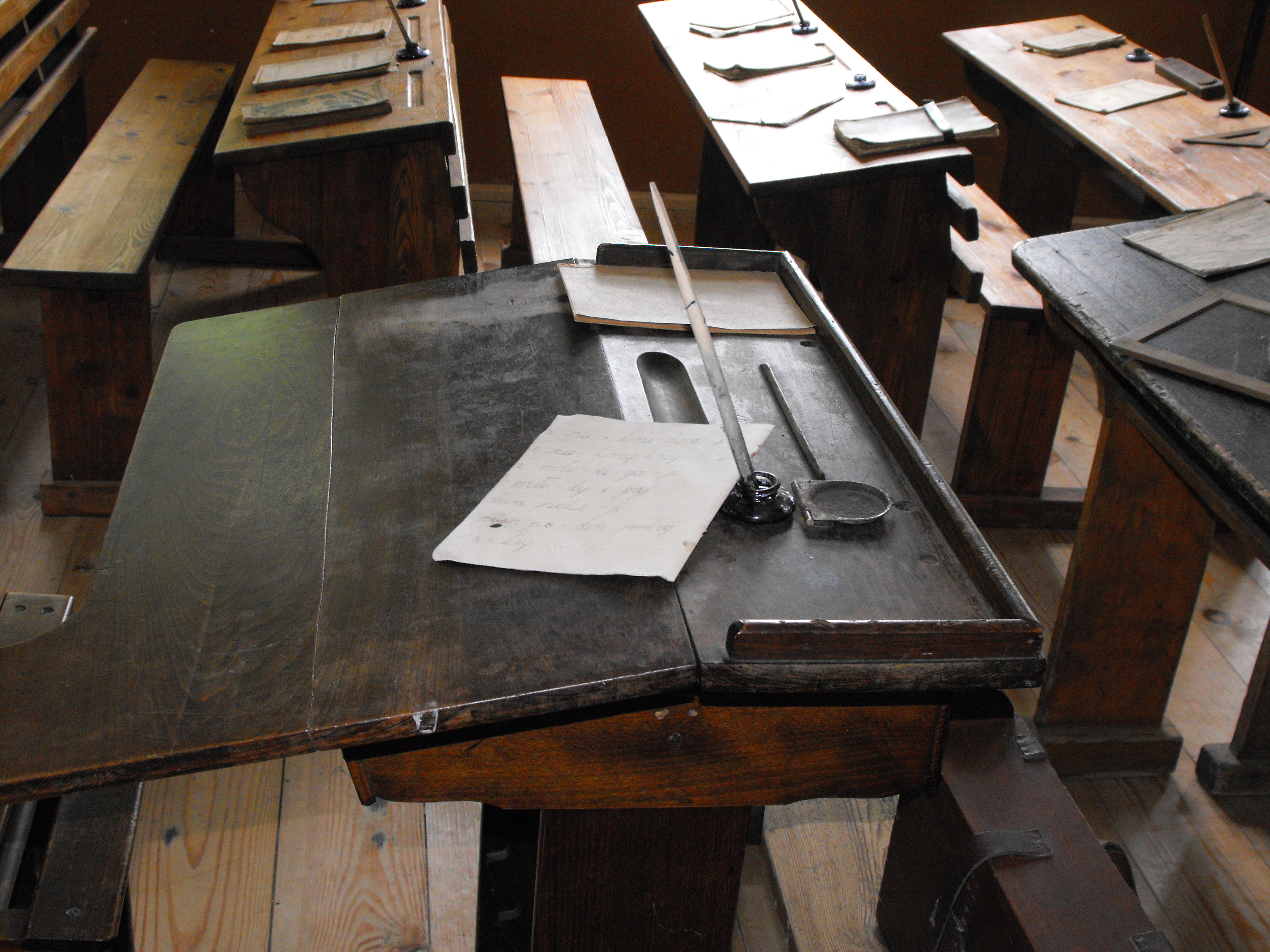 Wnętrze klasy w szkole ze wsi Nowiny koło Chodcza. Dwa rzędy ławek, na ławkach zeszyty, tabliczki wykonane z łupka bitumicznego z rysikami – używane do nauki pisania w klasach młodszych.