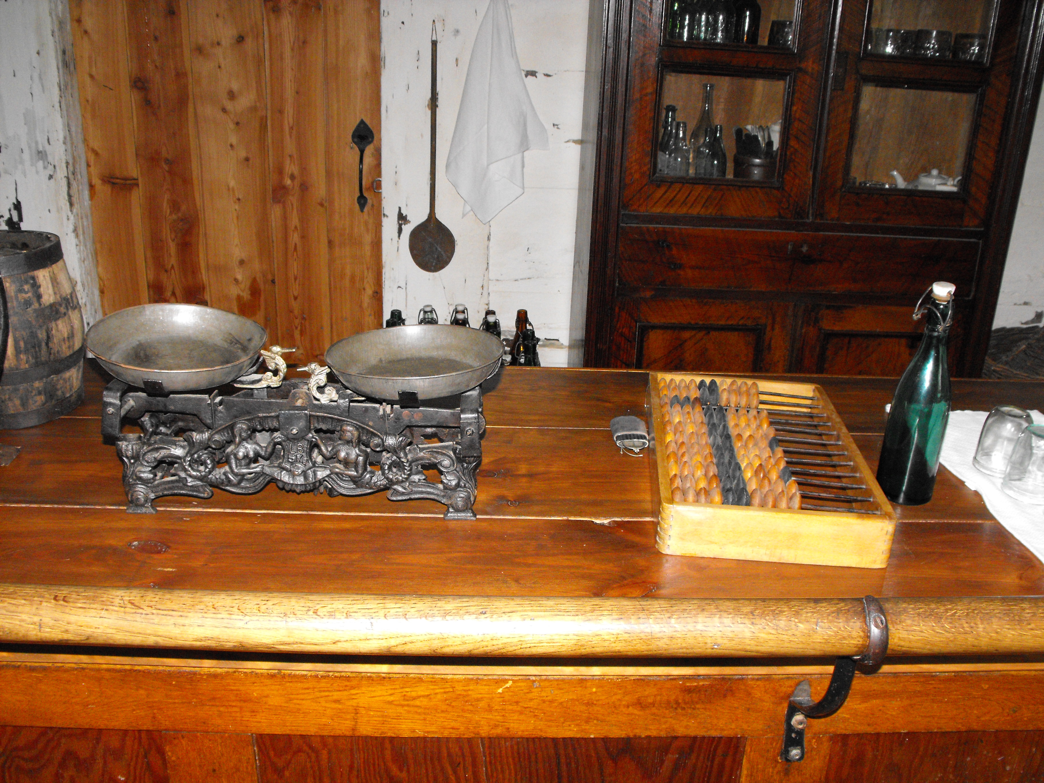 Wnętrze jednego z obiektów w skansenie w Kłóbce. Widoczne na zdjęciu: waga, liczydło