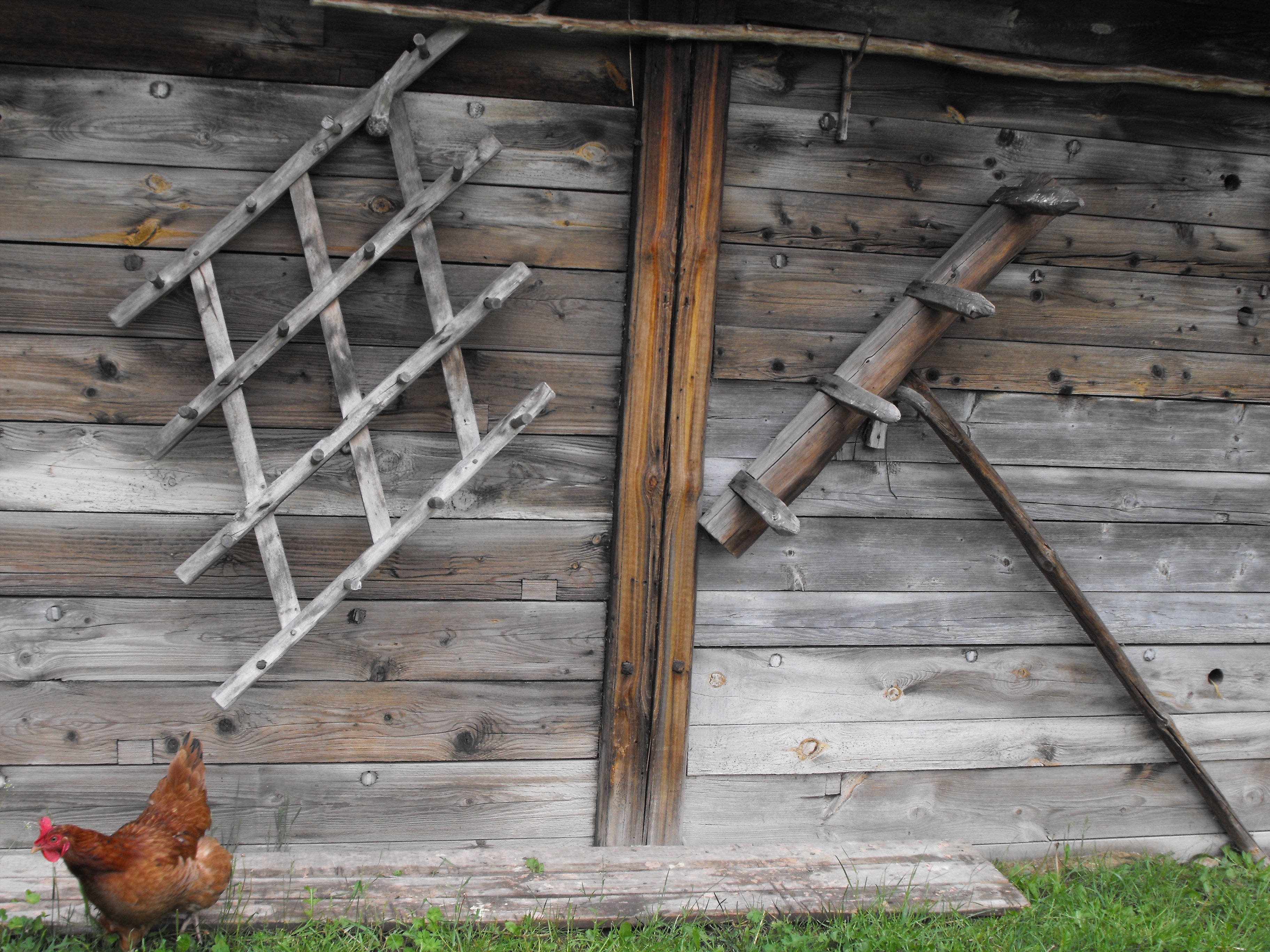 Ściana stodoły z miasta Kowal z 1802 roku. Wiszą na niej narzędzia rolnicze: brony i grzebienie.