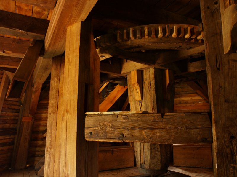 Wnętrze wiatraka. Główny mechanizm napędzający młyn.