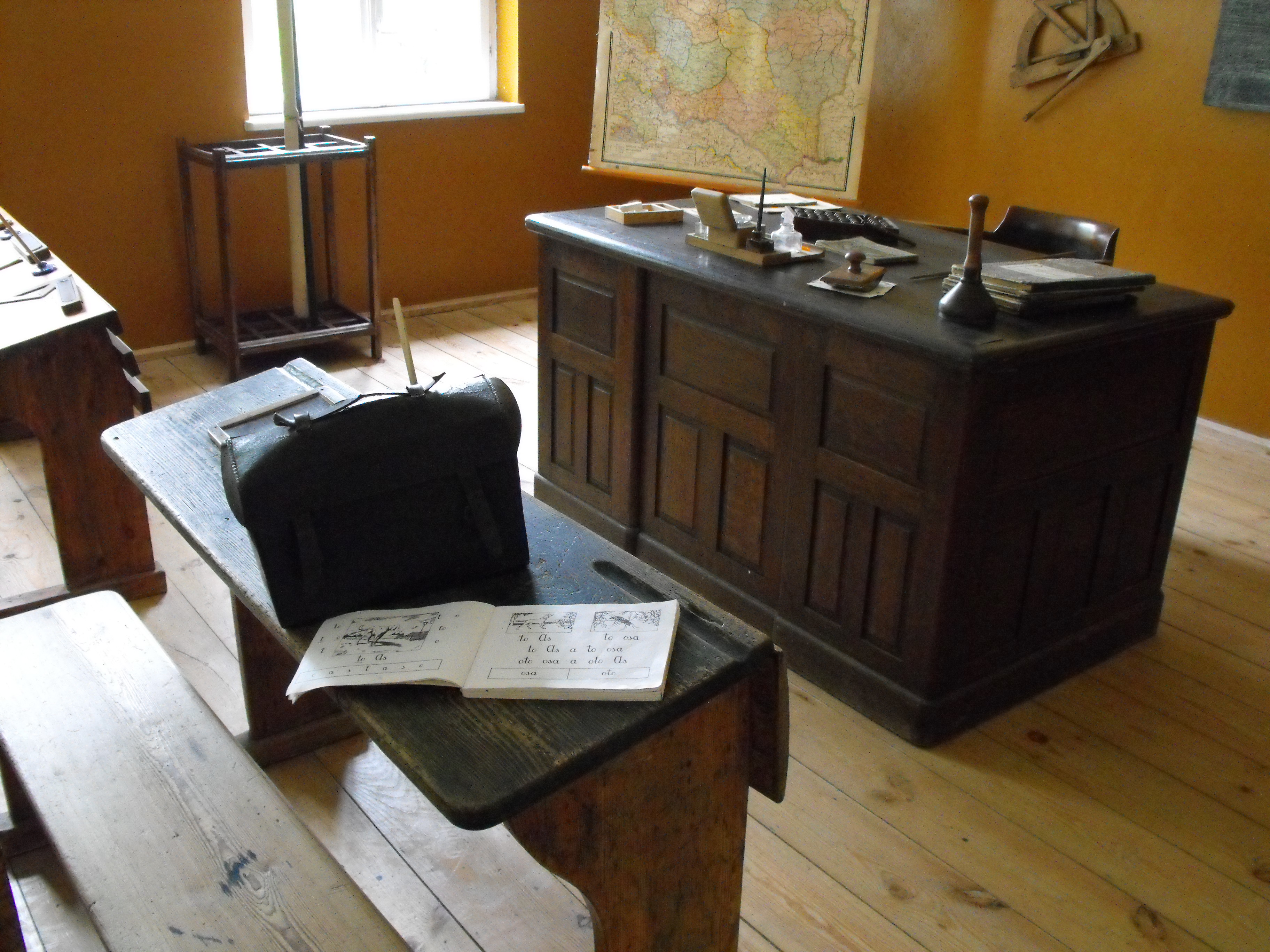 Wnętrze klasy w szkole wybudowanej w 1927 roku. Budynek pochodzi ze wsi Nowiny koło Chodcza.