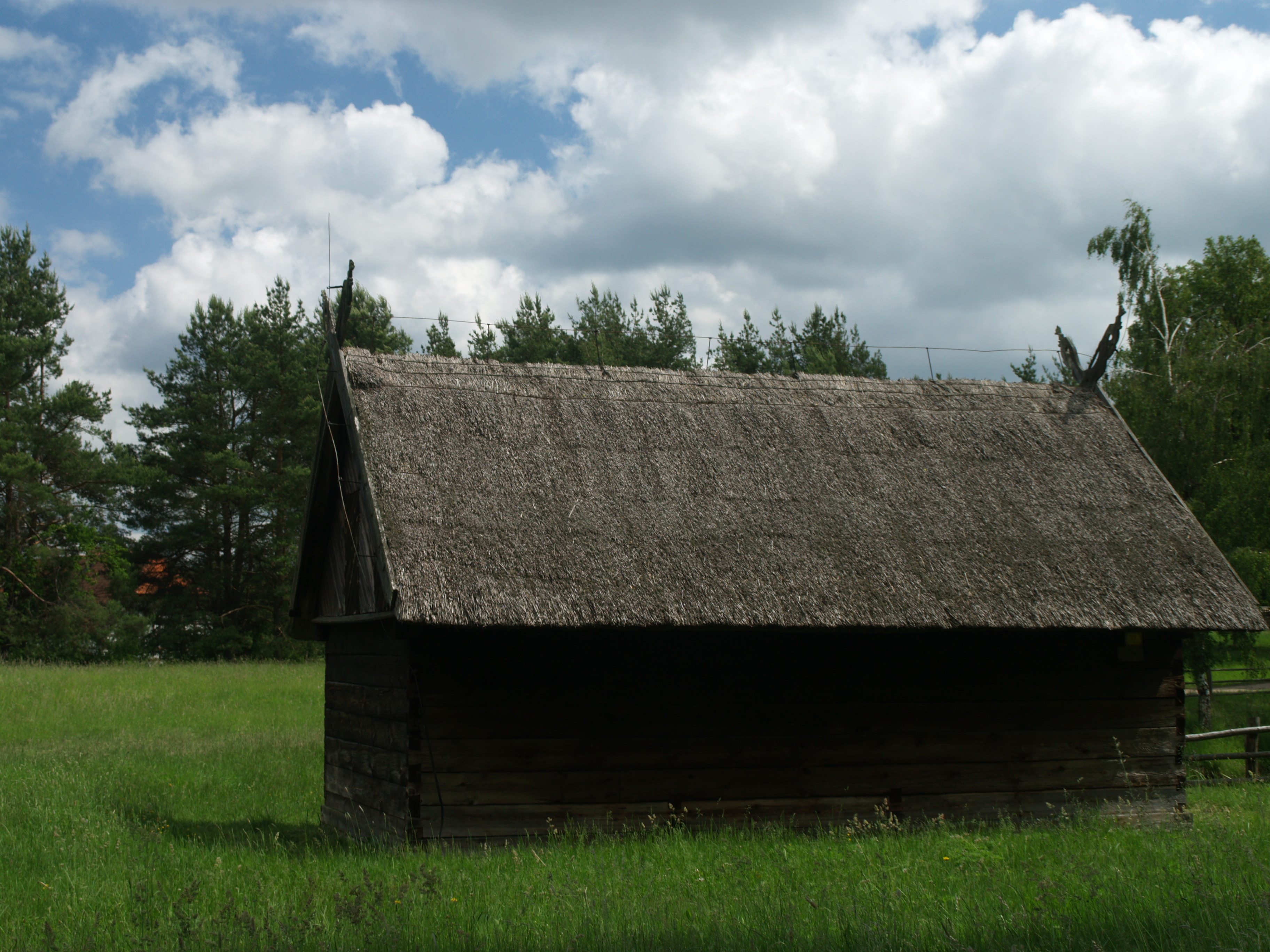 Budynek gospodarczy. Budynek o konstrukcji zrębowej z narożami łączonymi na "rybi ogon". Dach dwuspadowy kryty trzcinową strzechą. Szczyty ozdobione śparogami.
