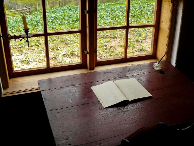 Biurko z kałamarzem i wysuwanym świecznikiem przed oknem dwuskrzydłowym.
