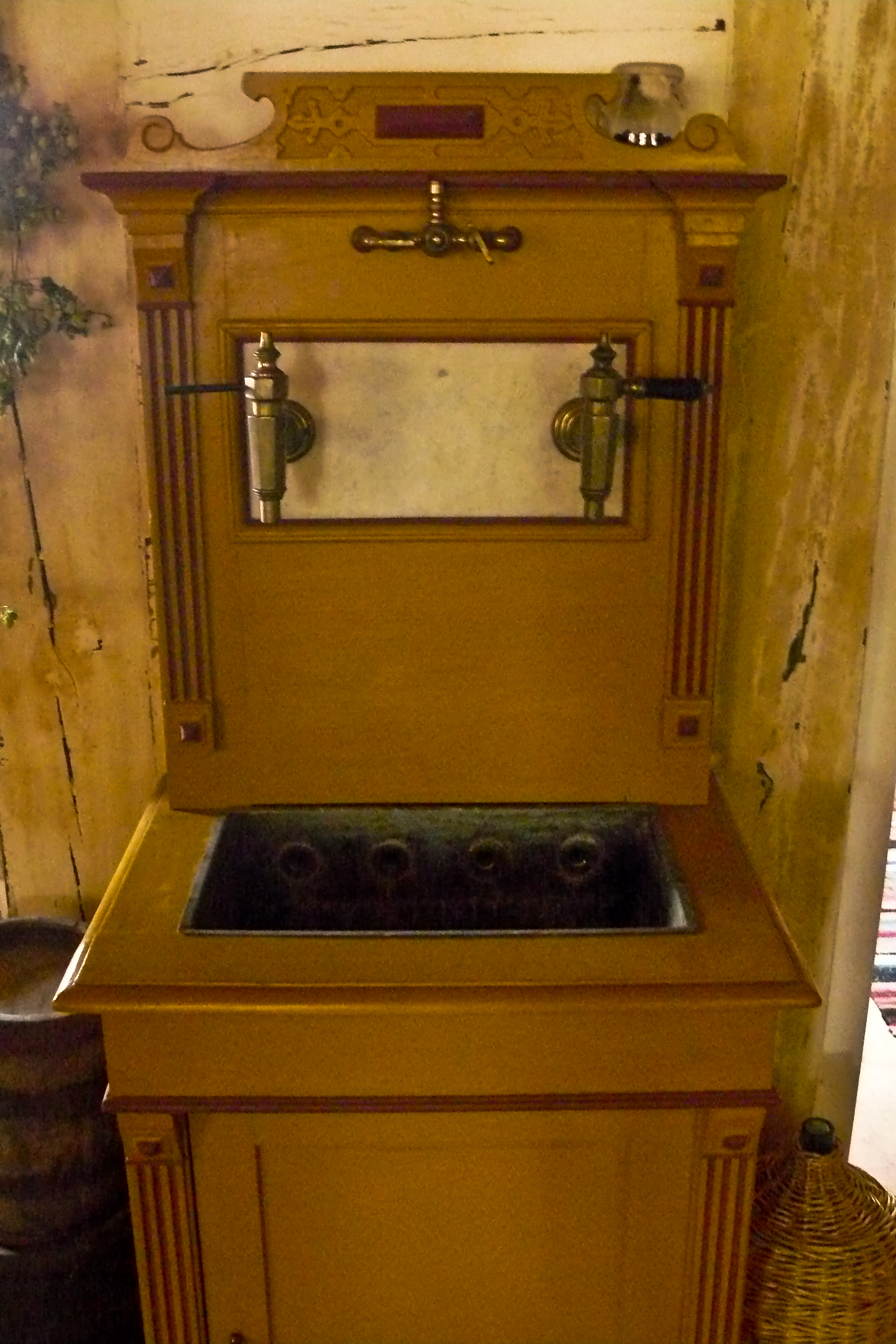 Drewniany, zdobiony zlew z kranami do ciepłej i zimnej wody.