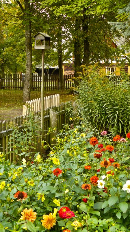 Kwiatowy ogród przydomowy z umieszczonym na wysokim słupie karmnikiem dla ptaków.