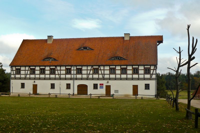 Stajnia dworska z Prosny z II połowy XVIII wieku. Budynek o konstrukcji szkieletowej z bielonymi ścianami. Dach dwuspadowy kryty dachówką.