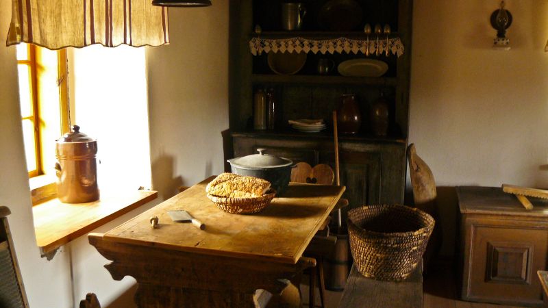 Wnętrze kuchni jednej z chałup. Na stole chleb, metalowy garnek i tasak, z tyłu drewniany kredens i przedmioty codziennego użytku: naczynia, maselnica, wiklinowy kosz, niecka na chleb.