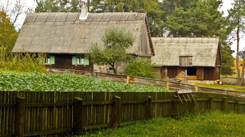 Widok na zagrodę mazurską. Chałupa ze wsi Gązwa z przełomu XVIII i XIX wieku. Budynek na kamiennej podmurówce. Chałupa o konstrukcji sumikowo-łątkowej mieszanej z kamienną. Dach dwuspadowy kryty strzechą z trzciny, wzmacniany kozłami.