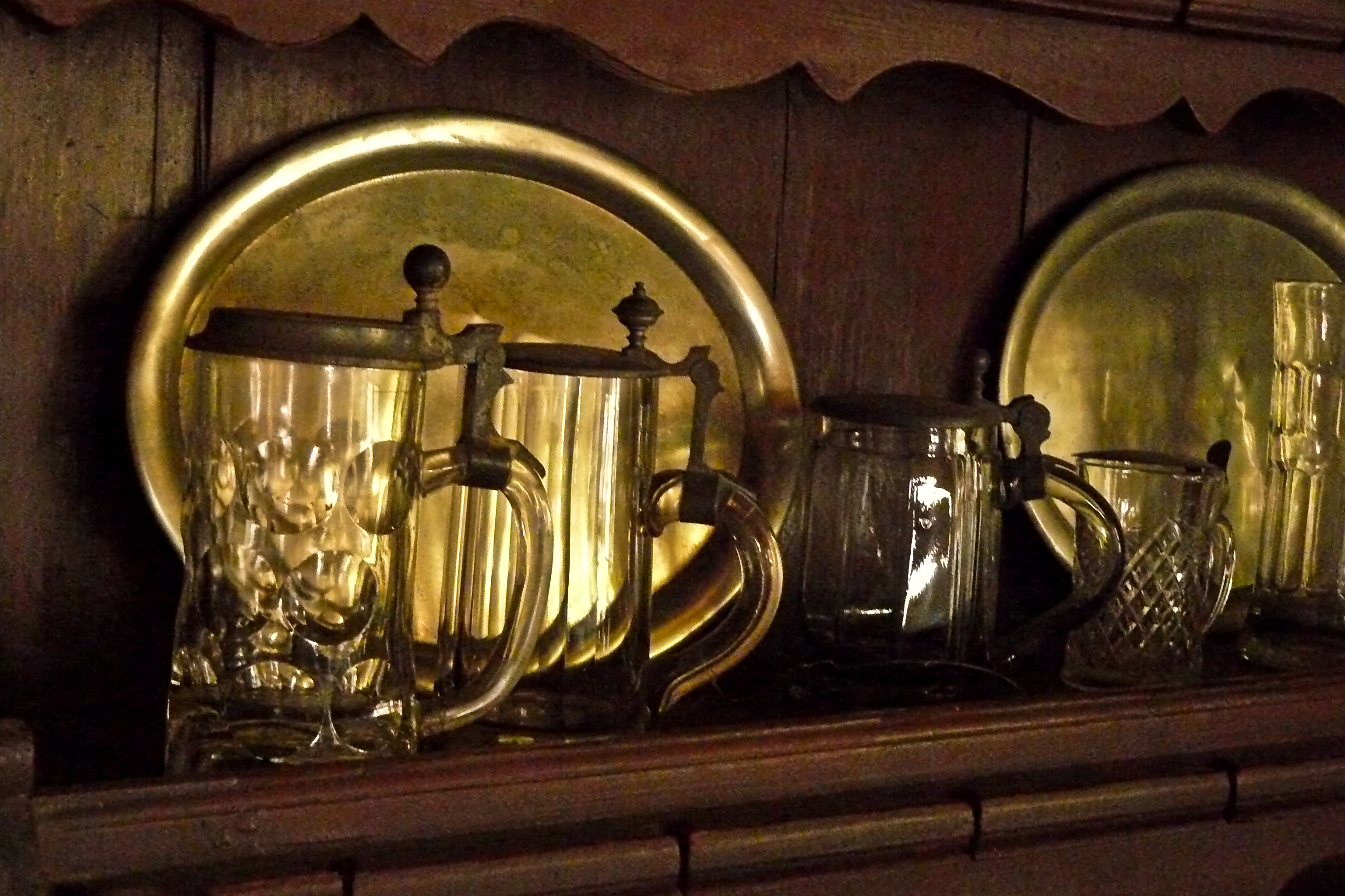 Wyposażenie karczmy: tace i kufle do piwa z klapką.