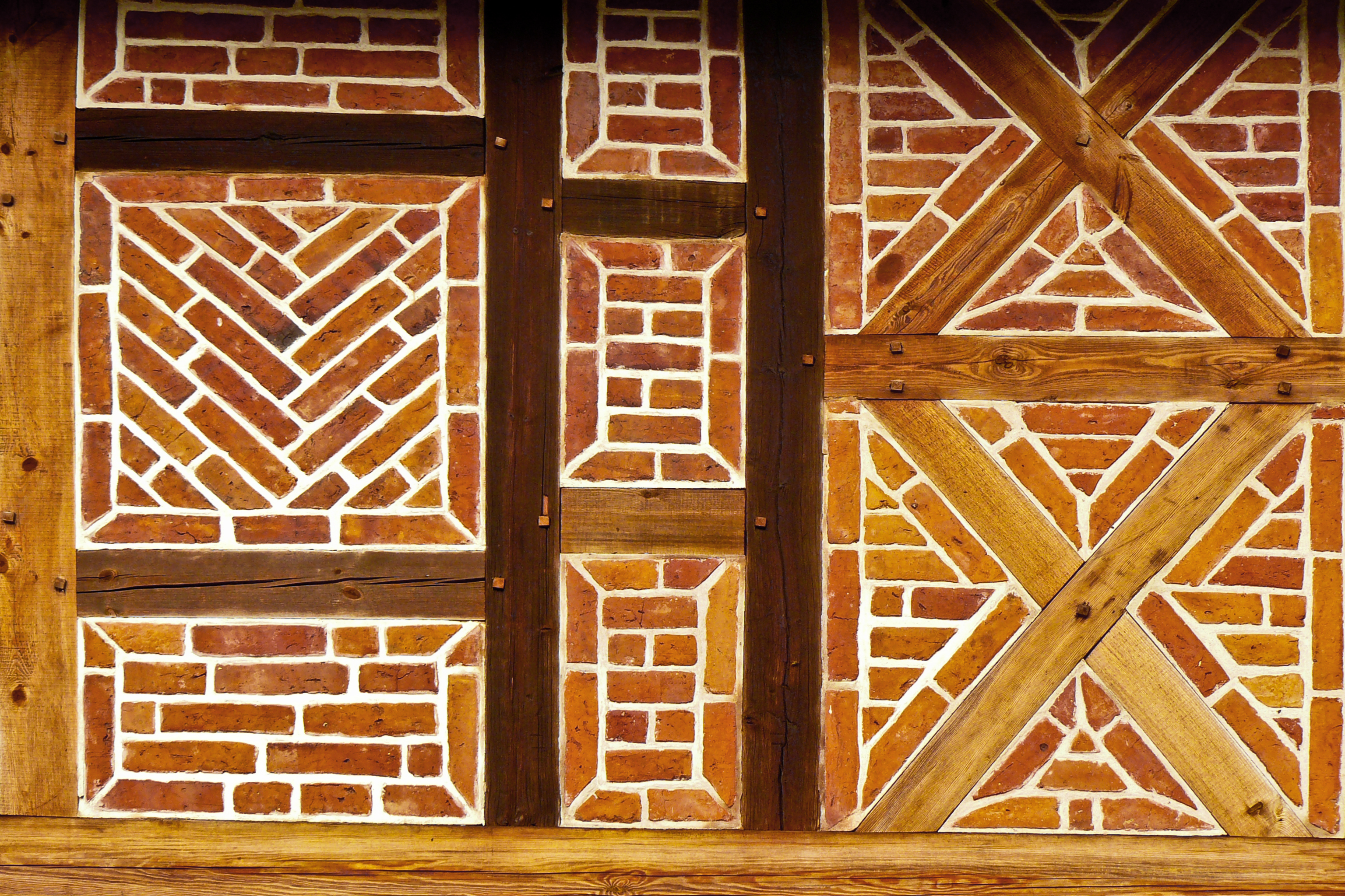 Fragment dekoracyjnej ściany "mur pruski" z mozaikowym wypełnieniem cegłą. Ryglowe cześci ściany z różnego typu drewna.