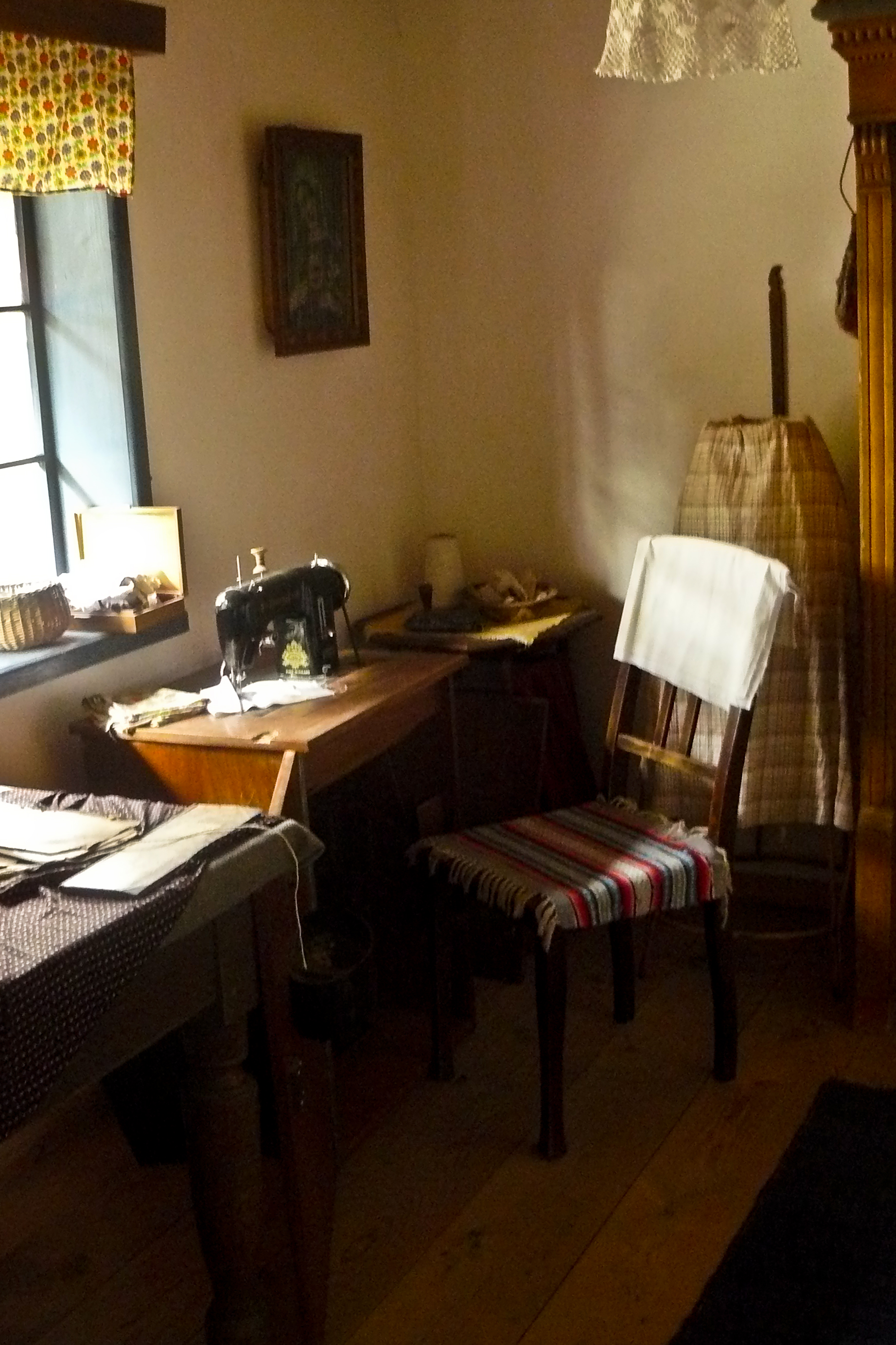 Zakład krawiecki we wnętrzu jednej z chałup.