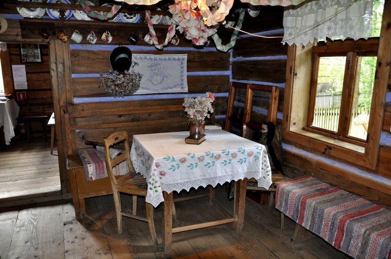 Zagroda Korkoszów w Czarnej Górze. Na zdjęciu wnętrze "wielkiej izby" dobudowanej w 1919 roku. Widoczny stół, ława i haftowana makatka. Podłoga z desek.