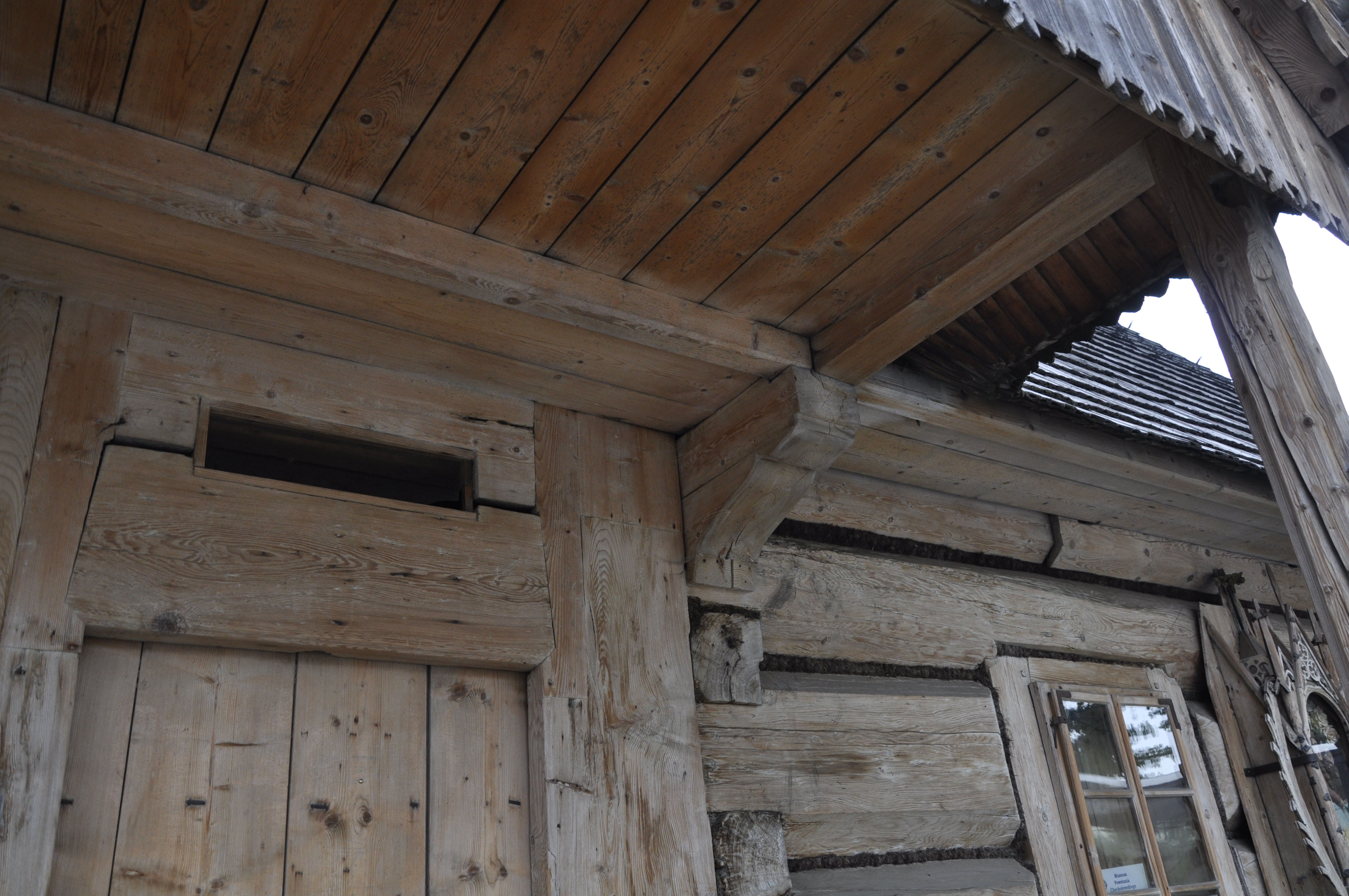 Fragment ganku chałupy Bafii. Na zdjęciu widać zrębową konstrukcję ścian z płazów i sposób osadzania krokwi dachu na płatwi ułożonej na końcach belek.