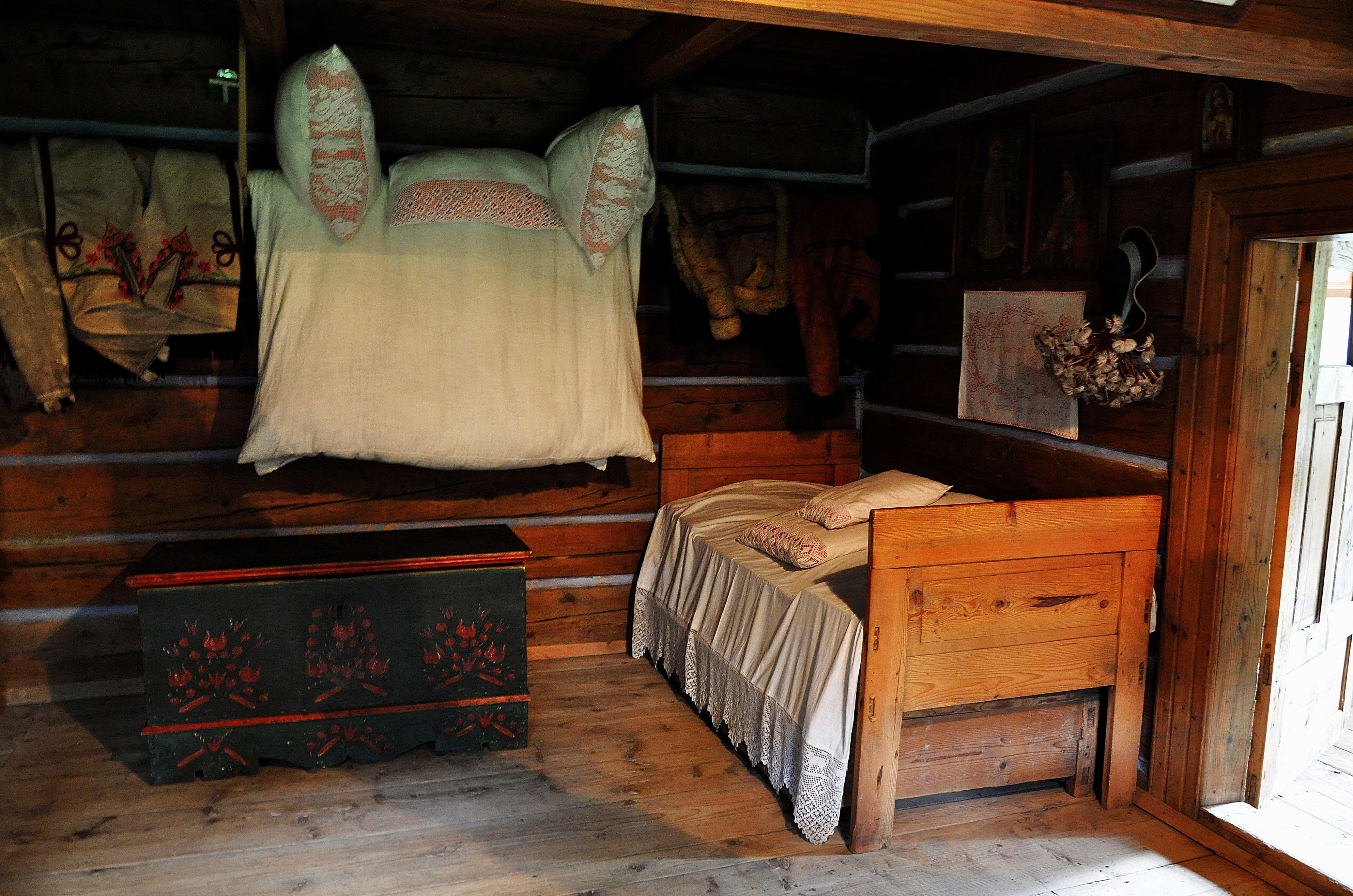 Wnętrze chałupy w zagrodzie Korkoszów w Czarnej Górze. Na zdjęciu widoczne łóżko drewniane, suszące się ubranie i pościel, oraz drewnianą, malowaną skrzynię spiską.