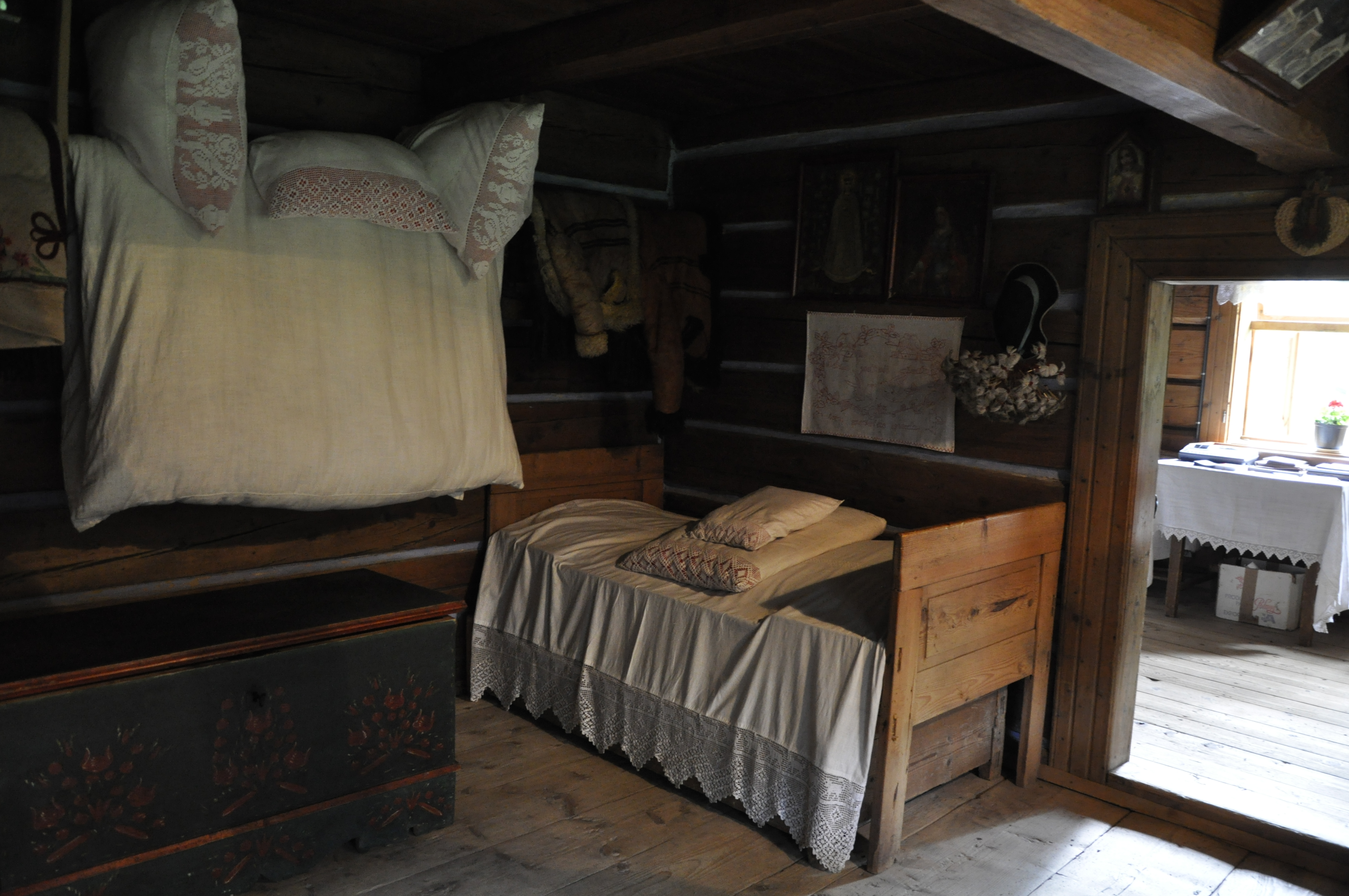 Zagroda Korkoszów w Czarnej Górze. Na zdjęciu wnętrze wielkiej izby, która pełniła funkcję sypialni. Widoczna technika przechowywania pościeli.
