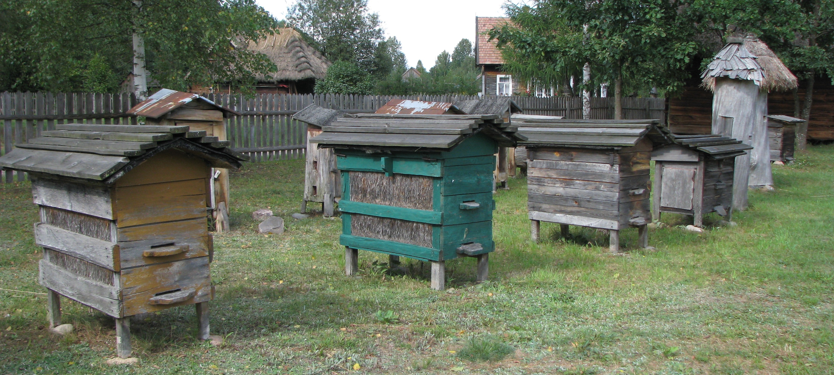 Pasieka. Ule domkowe ze słomianym i drewnianym wypełnieniem oraz ul kłodowy.