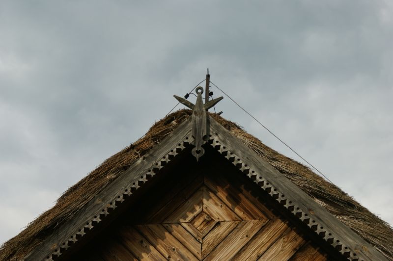 Fragment dachu chałupy ze wsi Dąbrowa Moczydły. Dach dwuspadowy kryty słomą i zabezpieczonego wiatrownicą. Na zdjęciu widać ozdobny pazdur i fragment szczytu wypełnionego szalunkiem w rąby.