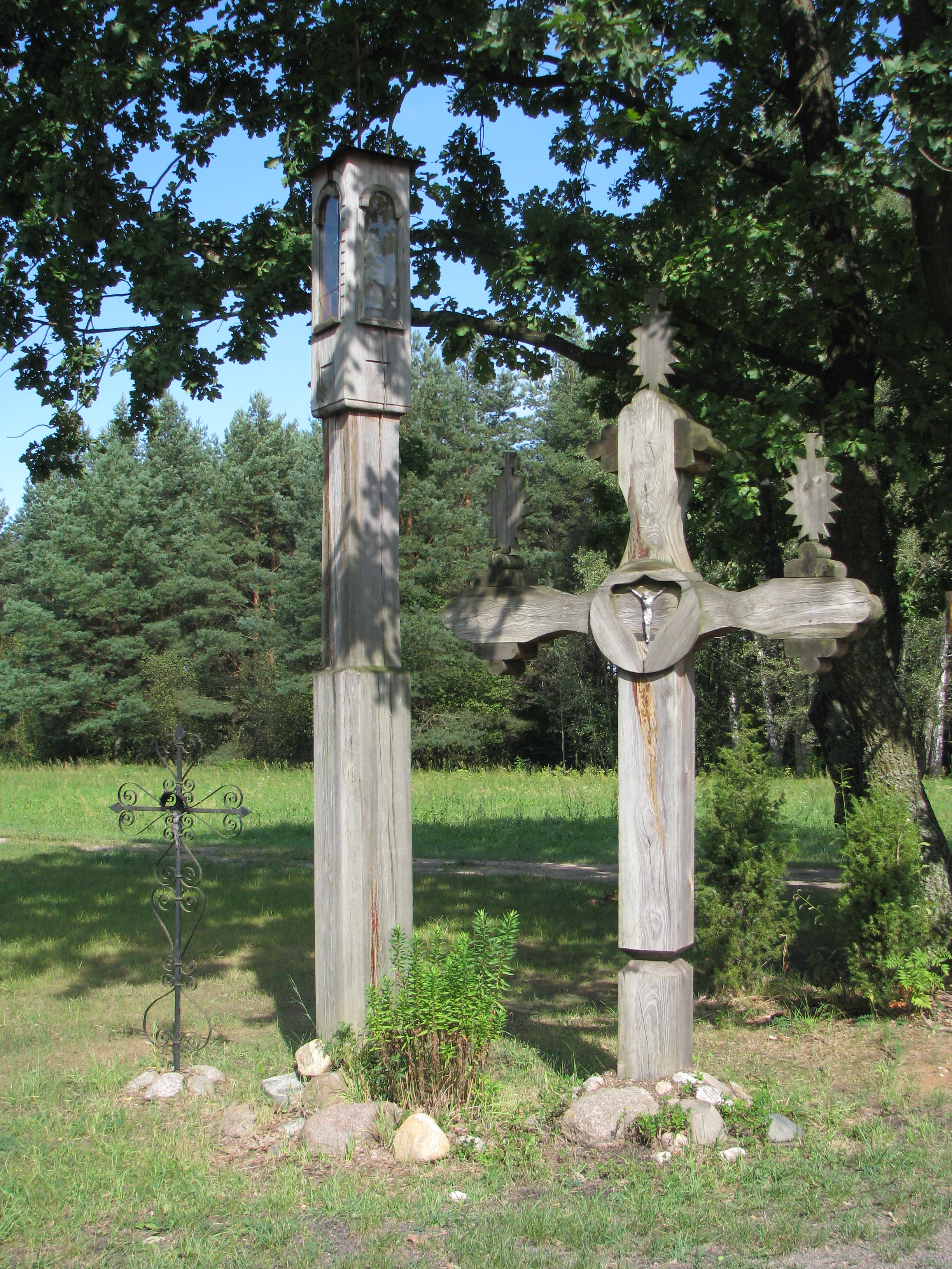 Drewniana, przydrożna kapliczka słupowa. Widoczne także: zdobiony krzyż drewniany oraz żelazny.