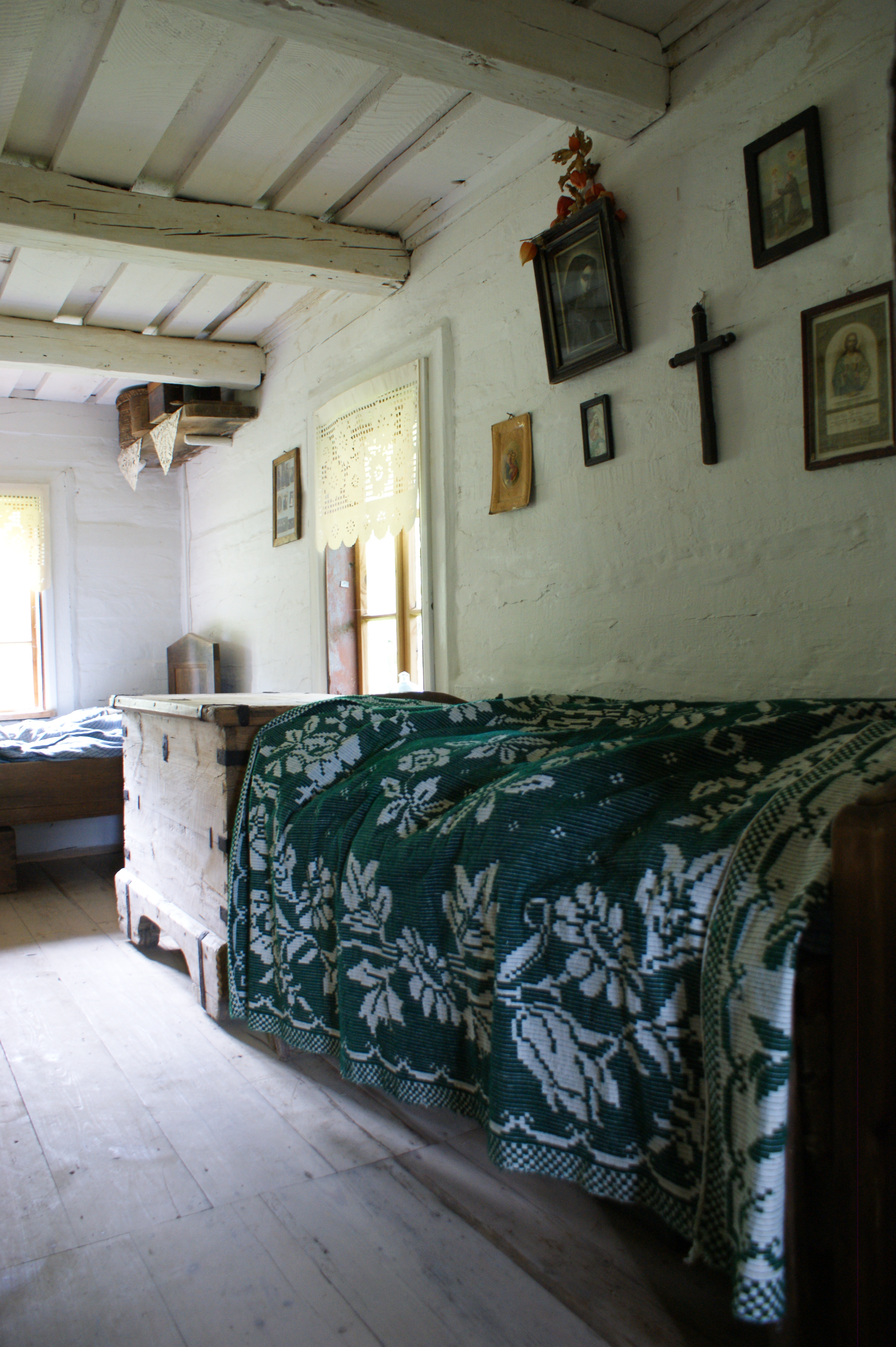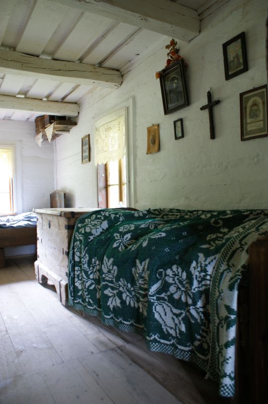 Wnętrze chałupy ze wsi Tymianki Bucie z przełomu XIX i XX wieku. Łóżka i drewniana skrzynia. Na ścianie święte obrazy i krzyżyk. Wnętrze prezentuje wyposażenie chałupy wielkopolskiej rodziny tymiańskiej, ale można tam znaleźć również przedmioty starsze.