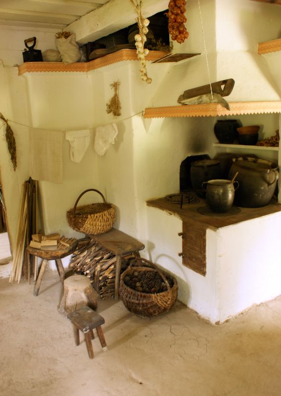 Kuchnia wewnątrz chałupy ze wsi Tymianki Bucie z przełomu XIX i XX wieku. Kuchnia z paleniskiem zamkniętym pod płytą (typ angielski) z piecem chlebowym i kapturem. Wykończenia pieca i kaptura zdobione dekoracyjnymi listwami. Podłoga z polepy glinianej. Kuchnia była pomieszczeniem, w którym przygotowano posiłki, wykonywano różne prace domowe. |