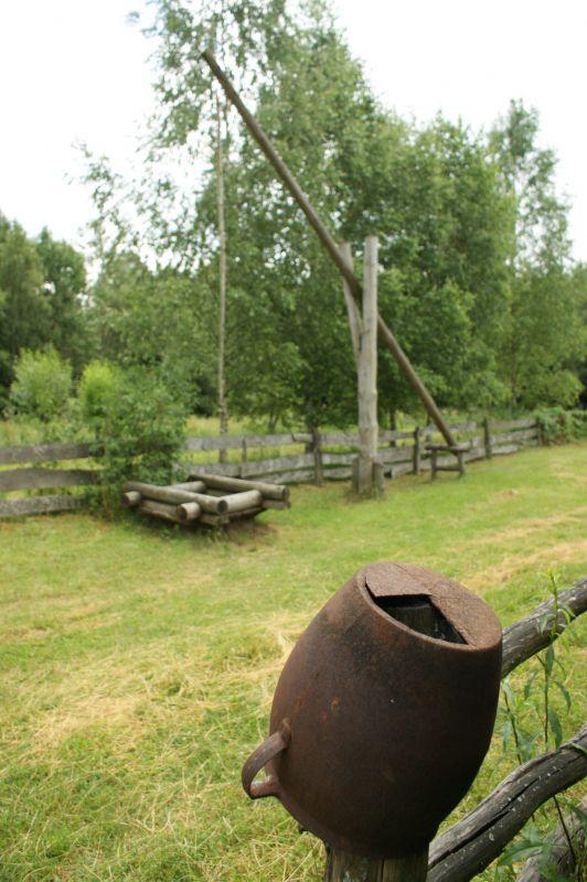Garnek suszący się na płocie. W tle studnia z żurawiem. Studnia o cembrowinie z bali drewnianych.