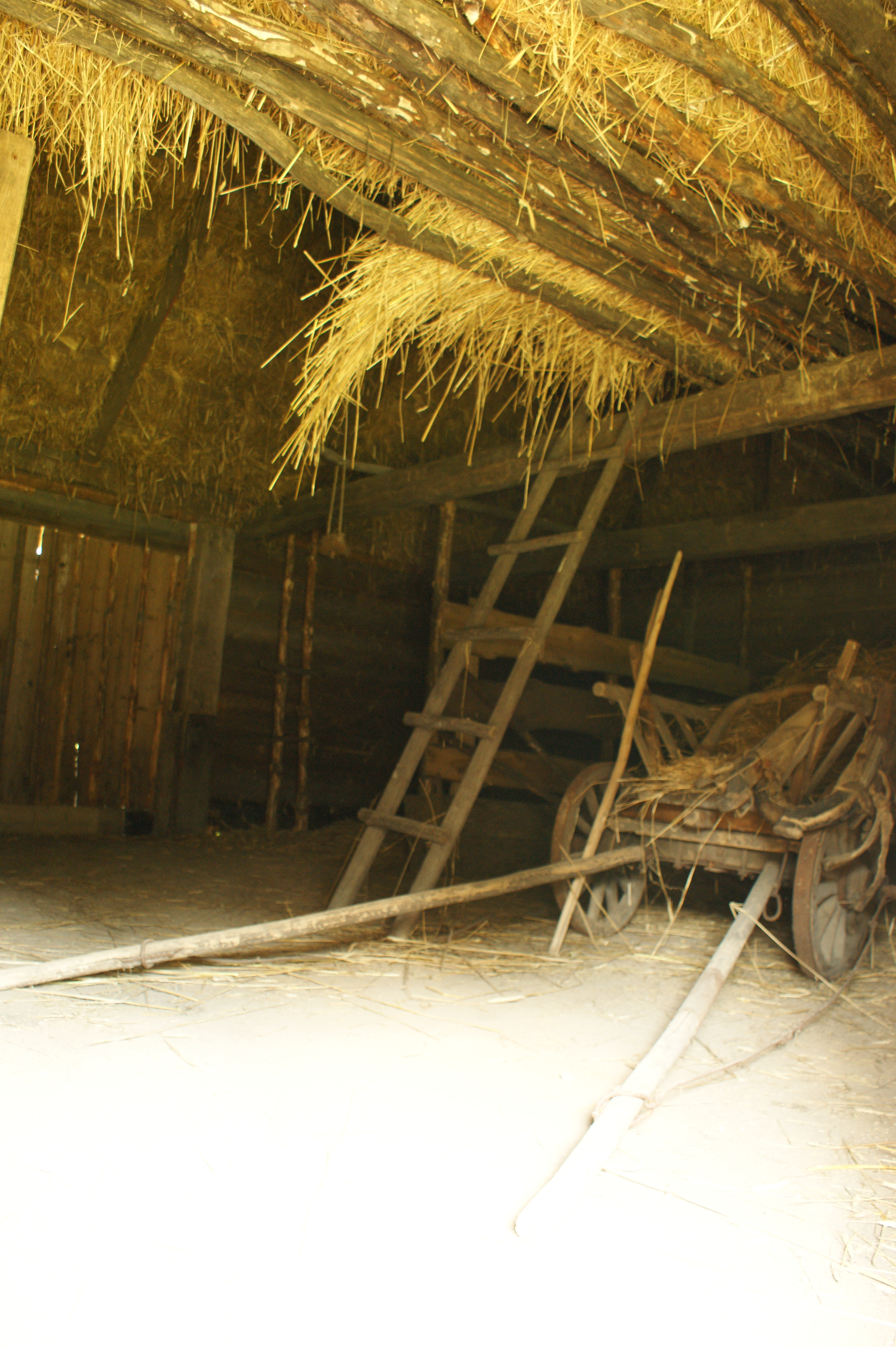 Wnętrze stodoły. Na zdjęciu widoczna krokwiowo-jętkowa konstrukcja dachu. W stodole stoi drewniany wóz drabiniasty.