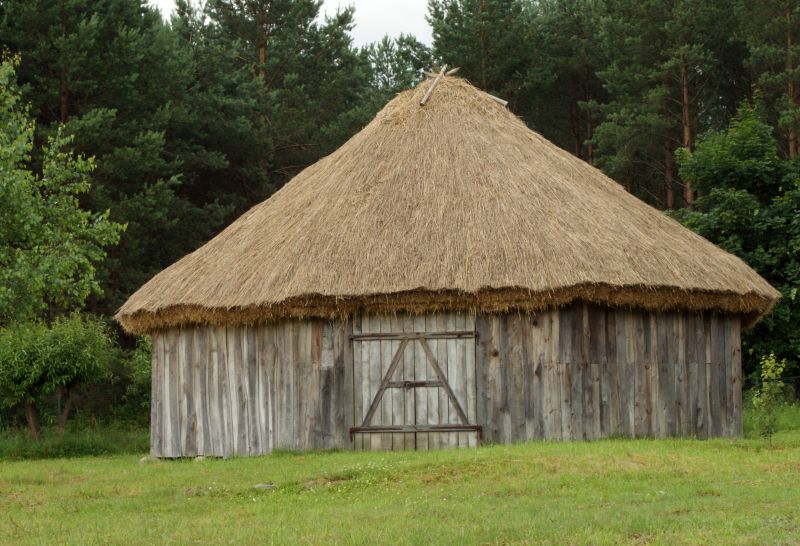 Maneż ze wsi Tybory Uszyńskie. Budynek na planie koła o konstrukcji słupowej szalowanej deskami. Dach stożkowy kryty słomianą strzechą.