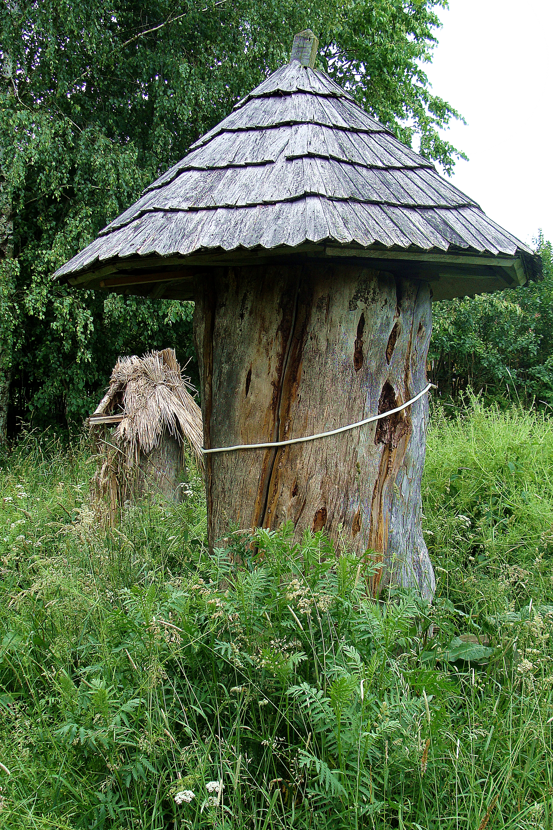 Ule wykonane w pniach drzew, stoją nieopodal wiatraka koźlaka.