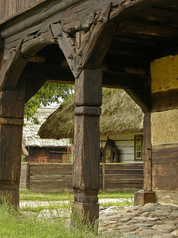 Widok na chałupę średnio zamożnego gospodarza ze wsi Ołobok z początku XIX w. przez podcień karczmy ze wsi Sokołowo Budzyńskie (koło Chodzieży) z XVIII wieku.