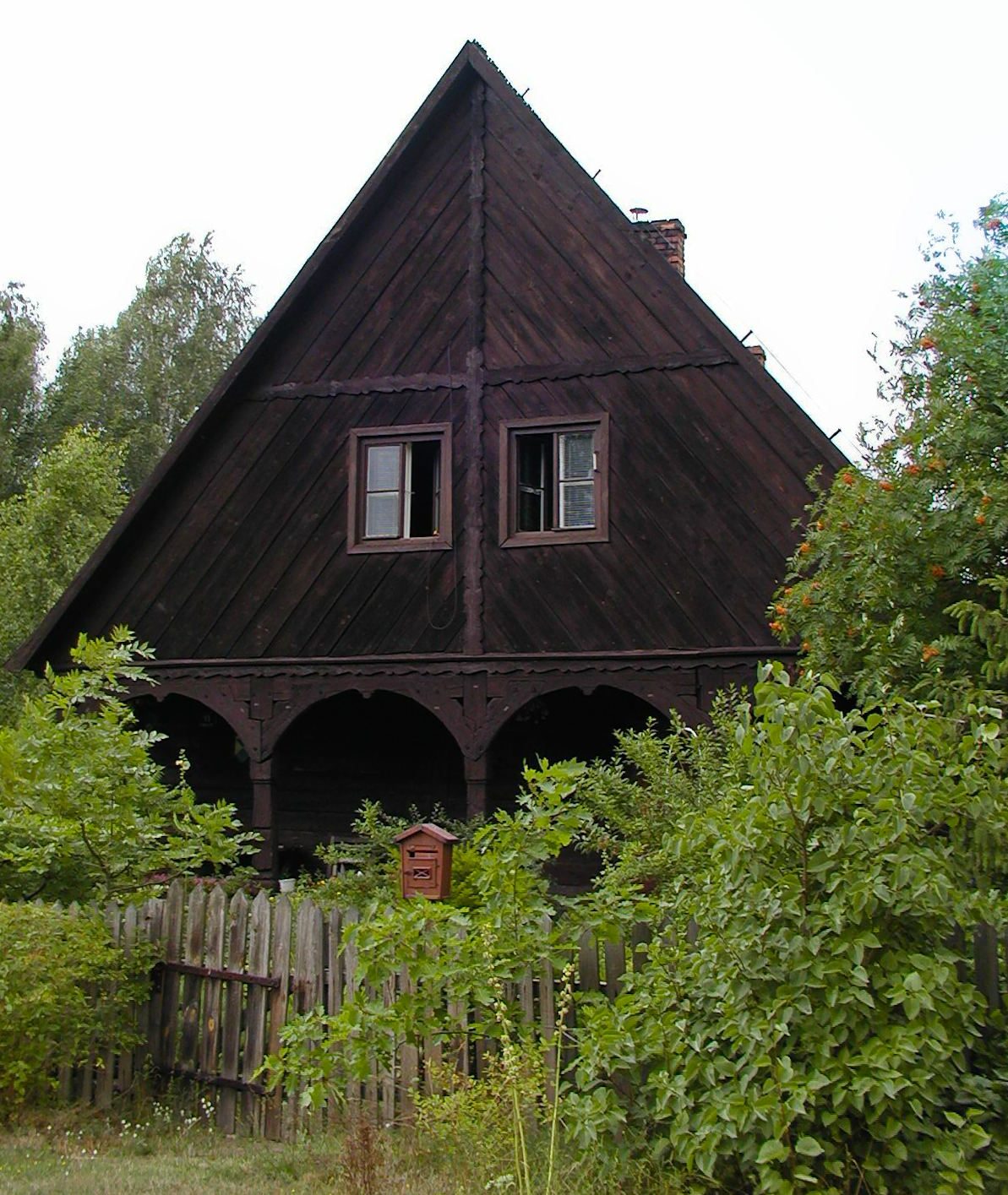 Chałupa ze wsi Gębarzewo (koło Gniezna), kopia budynku z 1829 roku z zachowanym oryginalnym podcieniem. Budynek o konstrukcji zrębowej z podcieniem od strony szczytowej. Chałupa dwukondygnacyjna. Szczyt oszalowano. Dach dwuspadowy. Budynek zasiedlony, należy do zespołu ekspozycyjnego we wsi Lednogóra. |